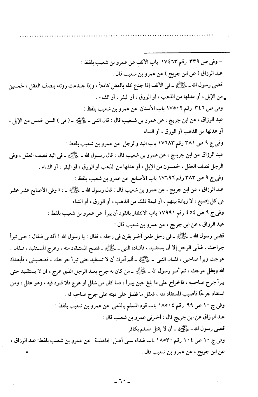 وفى جـ 10 ص 104 رقم 18530 باب فداء سبى أهل الجاهلية عن عمرو بن شعيب بلفظ: عبد الرزاق، عن ابن جريج، عن عمرو بن شعيب قال: =