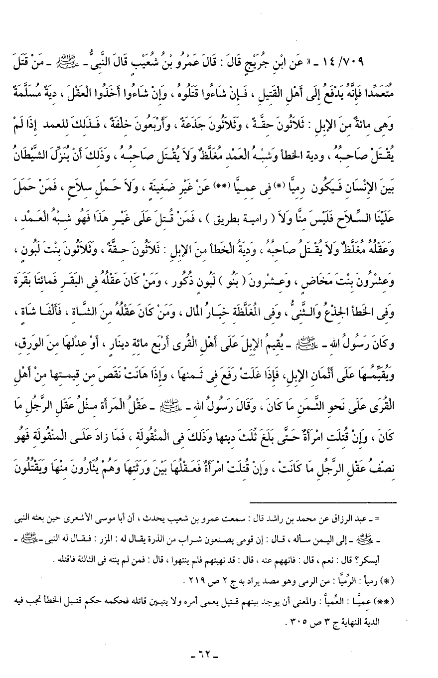 709/ 14 - "عَن ابْنِ جُرَيْجٍ قَالَ: قَالَ عَمْرُو بْنُ شُعَيْبٍ قَالَ النَّبِىُّ -صلى اللَّه عليه وسلم- مَنْ قَتَلَ مُتَعَمِّدا فَإِنَّهُ يَدْفَعُ إِلَى أَهْلِ الْقَتِيلِ، فَإنْ شَاءُوا قتَلُوهُ، وَإِنْ شَاءُوا أخَذُوا الْعَقْلَ، دِيَةً مُسَلَّمَة وَهِى مِائةٌ مِنَ الإبِلِ: ثَلَاثُونَ حِقَّةً، وَثَلَاثُونَ جَذَعَةً، وَأَرْبَعُونَ خِلفَةً، فَذَلِكَ لِلعمد إِذَا لَمْ يُقْتَلْ صَاحِبُهُ، ودية الخطأ وَشِبْهُ الْعَمْدِ مُغَلَّظٌ وَلَا يُقْتَل صَاحِبُهُ، وَذَلِكَ أَنْ يُنَزِّلَ الشَّيْطَانُ بَينَ الإِنْسَانِ فَيَكُون رِمِيَّا (*) في عِميَّا (* *) عَنْ غَيْرِ ضَغِينَةٍ، وَلَا حَمْلِ سِلاحَ، فَمَنْ حَمَلَ عَلَيْنَا السِّلَاح فَلَيْسَ مِنَّا وَلَا (رامية بطريق)، فَمَنْ قُتِلَ عَلَى غَيْرِ هَذَا فَهُو شِبْهُ الْعَمْدِ، وَعَقْلُهُ مُغَلَّظٌ وَلَا يُقْتَلُ صَاحِبُهُ، وَدِيَةُ الْخَطأ مِنَ الإبِلِ: ثَلَاثُونَ حِقَةً، وَثَلَاثُونَ بِنتَ لَبُونٍ، وَعِشْرُونَ بِنْتَ مَخَاضٍ، وَعِشْرونَ (بَنُو) لَبُونٍ ذُكُور، وَمَنْ كَانَ عَقْلُهُ في البَقَرِ فَمائِتَا بَقَرَة وَفِى الخَطأ الجِذع وَالثَّنِىُّ، وَفِى المُغَلَّظَةِ خِيَارُ المال، وَمَن كَانَ عَقْلُهُ مِنَ الشَّاةِ، فَأَلْفَا شَاةٍ، وكَانَ رَسُولُ اللَّهِ -صلى اللَّه عليه وسلم- يُقِيمُ الإبِلَ عَلَى أَهْلِ القُرى أَرْبَع مائِةِ دينَارٍ، أَوْ عِدْلهَا مِنَ الوَرِقِ، وَيُقيِّمُهَا عَلَى أَثْمَانِ الإبِلِ، فَإِذَا غَلَتْ رَفَعَ في ثَمنهَا، وَإِذَا هَانَتْ نَقَصَ مِن قِيمَتِها مِنْ أَهْلِ القُرَى عَلَى نَحوِ الثَّمَنِ مَا كَانَ، وَقَالَ رَسُولُ اللَّهِ -صلى اللَّه عليه وسلم- عَقْلُ الْمَرأَة مِثْلُ عَقْلِ الرَّجُلِ مَا كَانَ، وَإِنْ قُتِلَتِ امْرَأَةٌ حَتَّى بَلَغَ ثلَثَ دِيتها وَذَلكَ في الْمنْقُولَةِ، فَمَا زادَ عَلَى الْمنْقُولَةِ فَهُو نِصْفُ عَقْل الرَّجُلِ مَا كَانَتْ، وَإِنْ قُتِلَت امْرَأَةٌ فَعَقْلُهَا بَيْنَ وَرَثَتِهَا وَهُمْ يُثَأرونَ مِنْهَا وَيَقْتُلُونَ