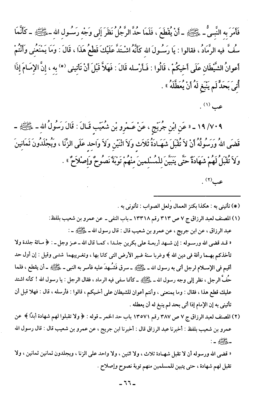 709/ 19 - "عَنِ ابْنِ جُرَيْجٍ، عَنْ عَمْرِو بْن شُعَيْبٍ قَالَ: قَالَ رَسُولُ اللَّهِ -صلى اللَّه عليه وسلم- قَضَى اللَّهُ وَرَسُولُهُ أَنْ لَا تُقْبَلَ شَهَادَةُ ثَلَاثٍ وَلَا اثْنَيْنِ وَلَا وَاحِد عَلَى الزِّنا، وَيُجْلَدُونَ ثَمَانِينَ وَلَا تُقْبَلُ لَهُمْ شَهَادَةٌ حَتَّى يَتَبَيَّنَ لِلمُسْلِمينَ مِنْهُمْ تَوْبَةٌ نَصُوحٌ وَإصْلَاحٌ".