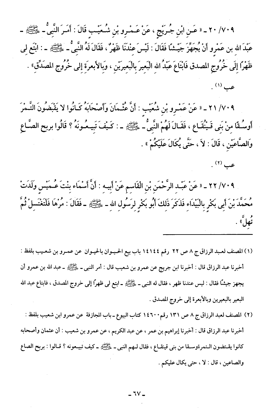709/ 21 - "عَن عَمْرِو بْنِ شُعَيْبٍ: أَنَّ عثمَانَ وَأَصْحَابَهُ كَانُوا لا يَقْبَضُونَ التَّمْرَ أَوسُقًا مِنْ بَنِى قَيْنُقَاع، فَقَالَ لَهُمْ النَّبِىُّ -صلى اللَّه عليه وسلم-: كَيْفَ تَبِيعُونَهُ؟ قَالُوا بربح الصَّاعِ وَالصَّاعَيْنِ، قَالَ: لَا، حَتَّى يُكَالَ عَلَيْكُمْ".