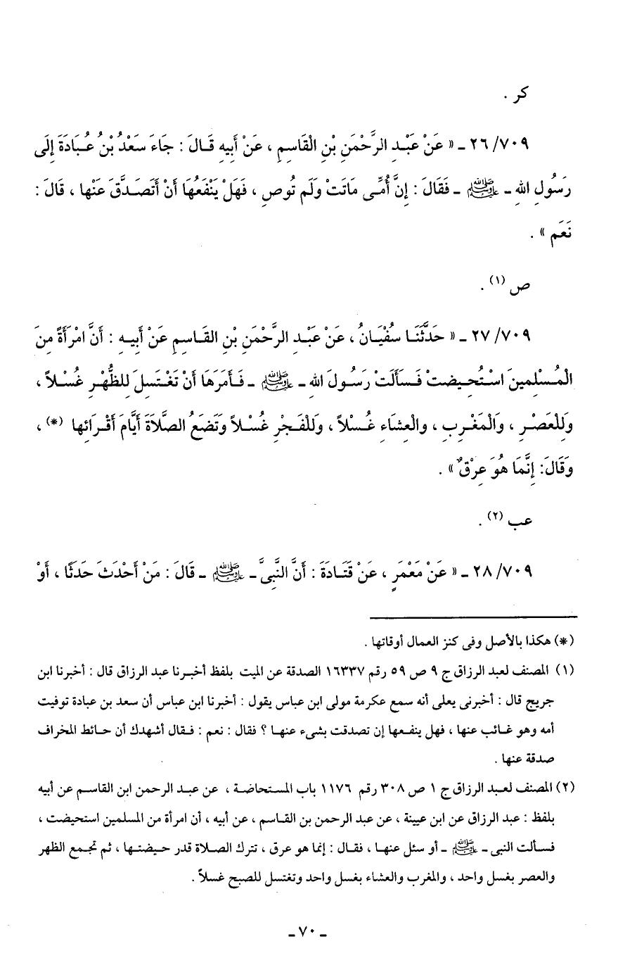 (¬2) المصنف لعبد الرزاق جـ 1 ص 308 رقم 1176 باب المستحاضة، عن عبد الرحمن ابن القاسم عن أبيه بلفظ: عبد الرزاق عن ابن عيينة، عن عبد الرحمن بن القاسم، عن أبيه، أن امرأة من المسلمين استحيضت، فسألت النبى -صلى اللَّه عليه وسلم- أو سئل عنها، فقال: إنما هو عرق، تترك الصلاة قدر حيضتها، ثم تجمع الظهر والعصر بغسل واحد، والمغرب والعشاء بغسل واحد وتغتسل للصبح غسلًا.