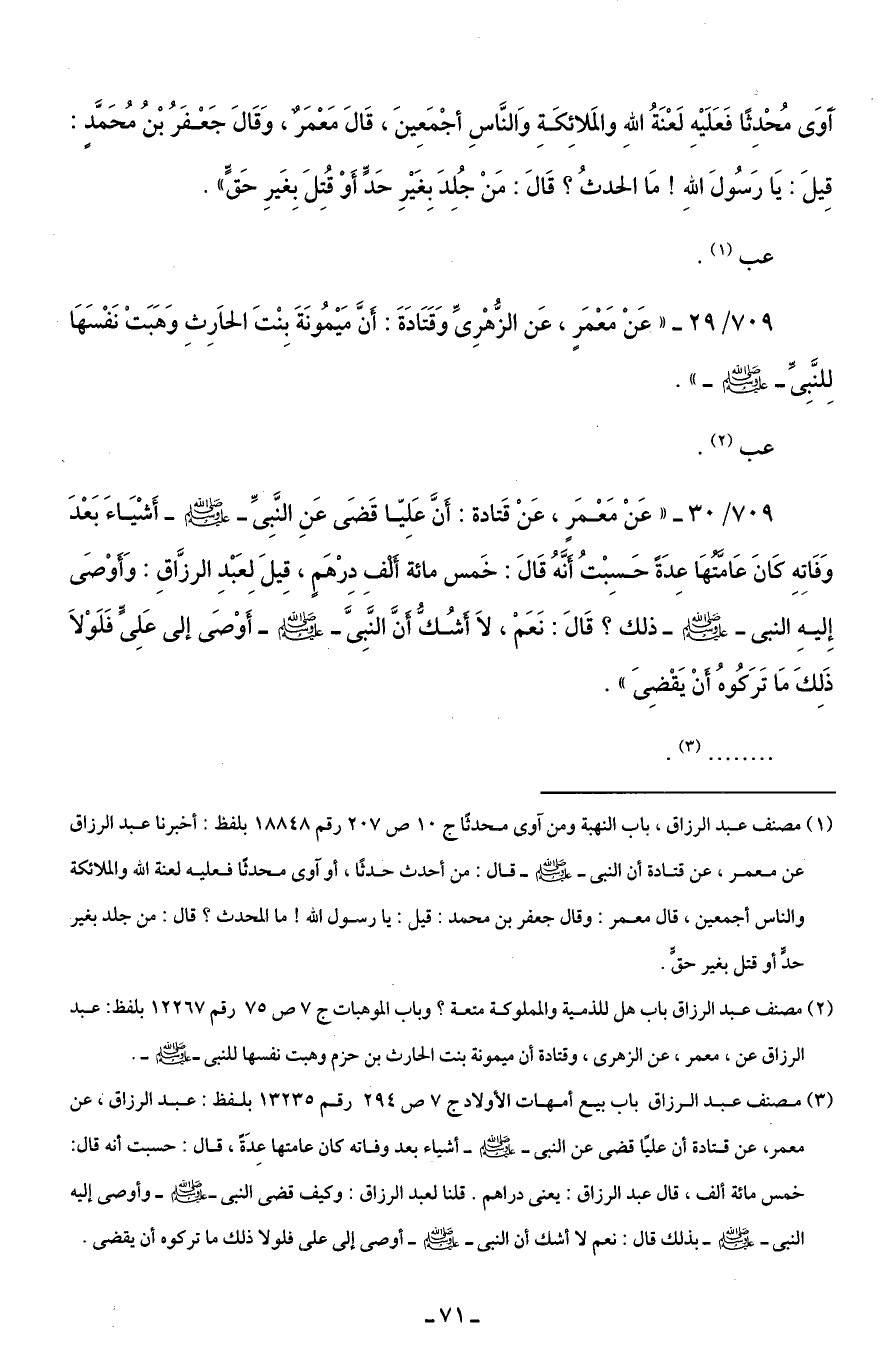 (¬1) مصنف عبد الرزاق، باب النهبة ومن آوى محدثًا جـ 10 ص 207 رقم 18848 بلفظ: أخبرنا عبد الرزاق عن معمر، عن قتادة أن النبى -صلى اللَّه عليه وسلم- قال: من أحدث حدثًا، أو آوى محدثًا فعليه لعنة اللَّه والملائكة والناس أجمعين، قال معمر: وقال جعفر بن محمد: قيل: يا رسول اللَّه! ما المحدث؟ قال: من جلد بغير حدٍّ أو قتل بغير حقٍّ.