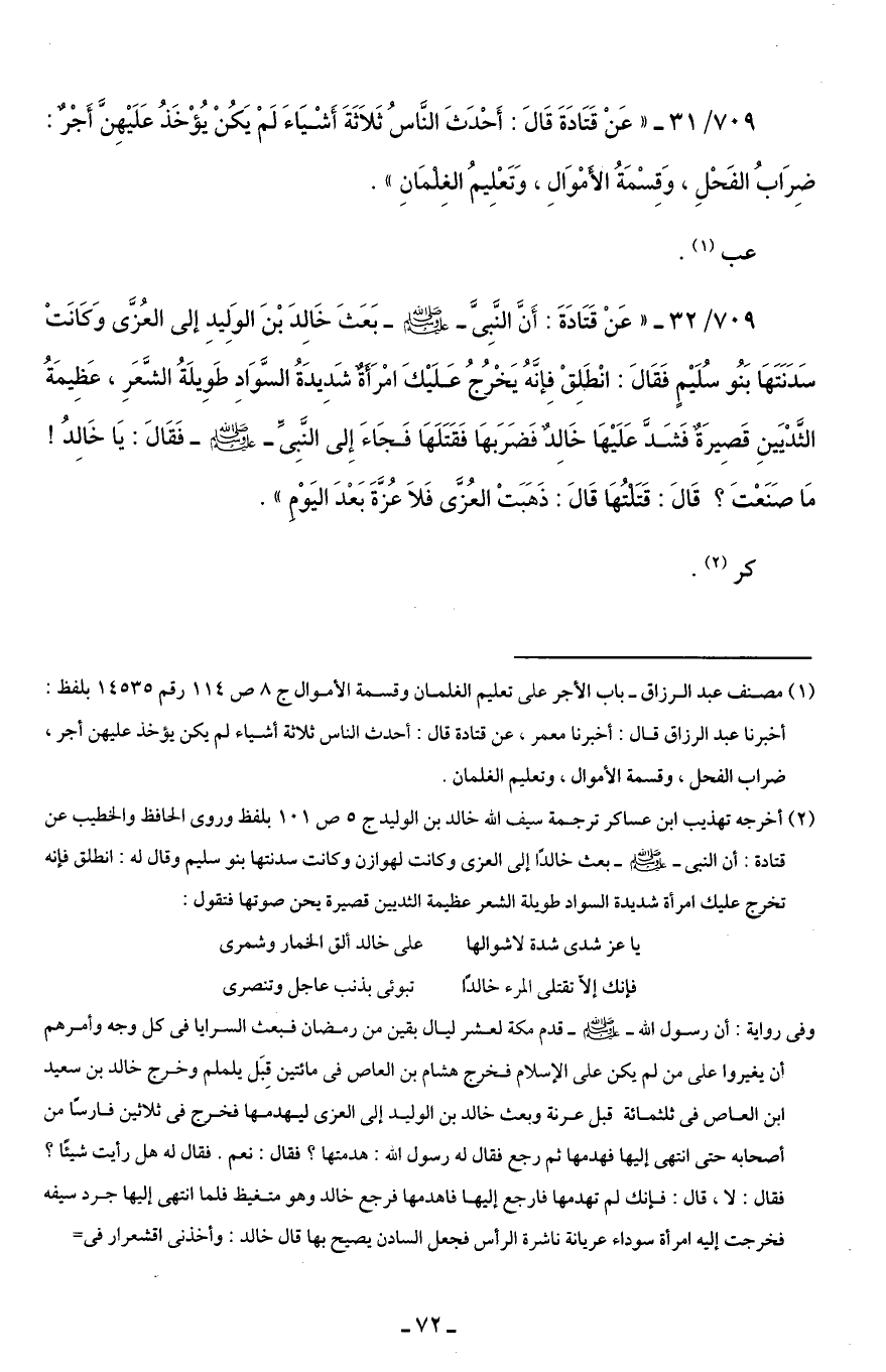 709/ 32 - "عَنْ قَتَادَةَ: أَنَّ النَّبِىَّ -صلى اللَّه عليه وسلم- بَعَثَ خَالِدَ بْنَ الوَلِيدِ إلى العُزَّى وَكَانَتْ سَدَنَتَهَا بَنُو سُلَيْمٍ فَقَالَ: انْطلِقْ فِإنَّهُ يَخْرُجُ عَلَيْكَ امْرَأَةٌ شَدِيدَةُ السَّوَادِ طَوِيلَةُ الشَّعَرِ، عَظِيمَةُ الثَّدْيَينِ قَصِيرَةٌ فَشَدَّ عَلَيْهَا خَالِدٌ فَضَرَبهَا فَقَتَلَهَا فَجَاءَ إِلى النَّبِىِّ -صلى اللَّه عليه وسلم- فَقَالَ: يَا خَالِدُ! مَا صَنَعْتَ؟ قَالَ: قَتَلتُهَا قَالَ: ذَهَبَتْ العُزَّى فَلَا عُزَّةَ بَعْدَ اليَوْمِ".