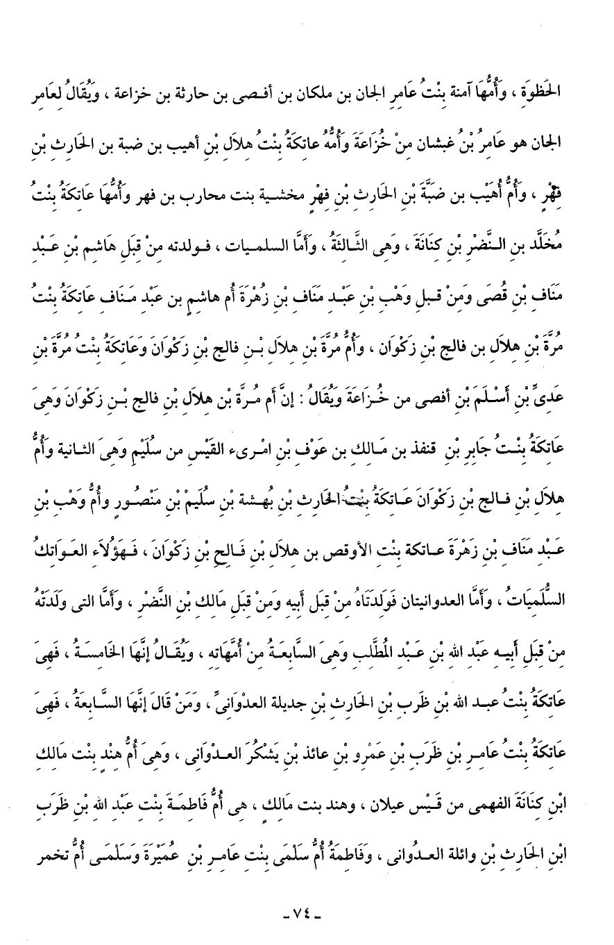 الحَظوَةِ، وَأُمُّهَا آمنة بِنْتُ عَامِرِ الجان بن ملكان بن أفصى بن حارثة بن خزاعة، وَيُقَالُ لِعَامِر الجان هو عَامِرُ بْنُ كبشان مِنْ خُزَاعَةَ وَأُمُّهُ عاتِكَةُ بِنْتُ هِلَالِ بْنِ أهيب بن ضبة بن الحَارِثِ بْنِ فِهْرٍ، وَأُمُ أُهَيْب بن ضَبَّةَ بْنِ الحَارِثِ بْنِ فِهْرٍ مخشية بنت محارب بن فهر وَأُمُّهَا عَاتِكَةُ بِنْتُ مُخَلَّد بنِ النَّضْرِ بْنِ كِنَانَةَ، وَهِى الثَّالِثَةُ، وَأَمَّا السلميات، فولدته مِنْ قِبَلِ هَاشِم بْنِ عَبْدِ مَنَافِ بْنِ قُصَى وَمِنْ قبلِ وَهْبِ بْنِ عَبْدِ مَنَافِ بْنِ زُهْرَةَ أُم هاشِمٍ بن عَبْدِ مَنَافِ عَاتِكَةُ بِنْتُ مُرَّةَ بْنِ هِلَالِ بن فالج بْنِ زَكْوَان، وَأُمُّ مُرَّةَ بْنِ هِلَاكِ بْنِ فالج بْنِ زَكْوَانَ وَعَاتِكَةُ بِنْتُ مُرَّة بْنِ عَدِىِّ بْنِ اسْلَمَ بْنِ أفصى من خُزَّاعَةَ وَيُقَالُ: إِنَّ أَم مُرَّة بْن هِلَالِ بْنِ فالج بْنِ زَكْوَانَ وَهِى عَاتِكَةُ بِنْتُ جَابِرِ بْنِ قنفذ بن مَالِكِ بن عَوْفِ بْنِ امْرئ القَيْسِ من سُلَيْم وَهِى الثانية وَأُمُّ هِلَالِ بْنِ فالج بْنِ زَكْوَانَ عَاتِكَةُ بنْتُ الْحارِثِ بْنِ بُهشة بْنِ سُلَيمْ بْنِ مَنْصُورٍ وأُمُّ وَهْبِ بْنِ عَبْدِ مَنَافِ بْنِ زَهْرَةَ عاتكة بِنْتِ الأوقص بن هِلَالِ بْنِ فَالِح بْنِ زَكْوَانَ، فَهَؤُلَاءِ العَوَاتِكُ السُّلَمِيَاتُ، وَأَمّا العدوانيتان فَوَلِدَتَاهُ مِنْ قِبَل أَبِيهِ وَمِنْ قِبَلِ مَالِكِ بْنِ النَّضْرِ، وَأَمَّا التى وَلَدَتْهُ مِنْ قِبَلِ أَبِيهِ عَبْدِ اللَّهِ بْنِ عَبْدِ المُطَّلِبِ وَهِى السَّابِعَةُ مِنْ أُمَّهَاتِهِ، وَيُقَالُ إنَّهَا الخَامِسَةُ، فَهِى عَاتِكَةُ بِنْتُ عبد اللَّه بْنِ ظَربِ بْنِ الحَارِثِ بْنِ جديلة العدْوَانِىِّ، وَمَنْ قَالَ إنَّهَا السَّابِعَةُ، فَهِى عَاتِكَةُ بِنْتُ عَامِرِ بْنِ ظَرَبِ بْنِ عَمْرِو بْنِ عائذ بْنِ يَشْكُرَ العدْوَانِى، وَهِى أُمُّ هِنْدٍ بِنْت مَالِكِ ابْنِ كِنَانَةَ الفهمى من قَيْس عيلان، وهند بنت مَالِك، هى أُمُّ فَاطِمَةَ بِنْتِ عَبْدِ اللَّهِ بْنِ ظَرَبِ ابْنِ الحَارِثِ بْنِ وائلة العدوانى، وَفَاطِمَةُ أُمُّ سَلمَى بِنْتِ عَامِرِ بْنِ عُمَيْرَةَ وَسَلْمَى أُمُّ تخمر