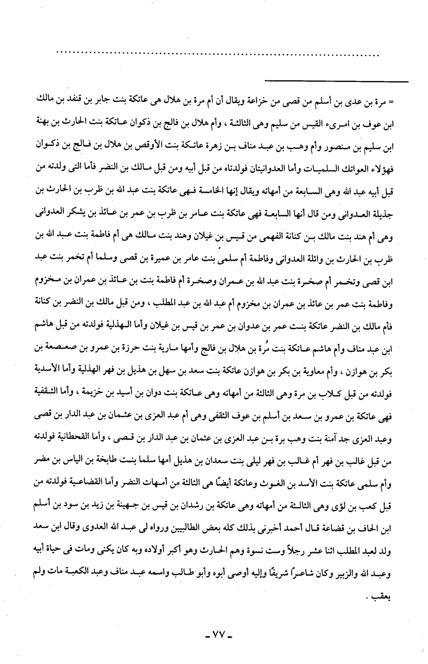= مرة بن عدى بن أسلم من قصى من خزاعة ويقال أن أم مرة بن هلال هى عاتكة بنت جابر بن قنفد بن مالك ابن عوف بن امرئ القيس من سليم وهى الثالثة، وأم هلال بن فالج بن ذكوان عاتكة بنت الحارث بن بهنة ابن سليم بن منصور وأم وهب بن عبد مناف بن زهرة عاتكة بنت الأوقص بن هلال بن فالج بن ذكوان فهؤلاء العواتك السلميات وأما العدوانيتان فولدتاه من قبل أبيه ومن قبل مالك بن النضر فأما التى ولدته من قبل أبيه عبد اللَّه وهى السابعة من أمهاته ويقال إنها الخامسة فهى عاتكة بنت عبد اللَّه بن ظرب بن الحارث بن جذيلة العدوانى ومن قال أنها السابعة فهى عاتكة بنت عامر بن ظرب بن عمر بن عائذ بن يشكر العدوانى وهى أم هند بنت مالك بن كنانة الفهمى من قيس بن غيلان وهند بنت مالك هى أم فاطمة بنت عبد اللَّه بن ظرب بن الحارث بن وائلة العدوانى وفاطمة أم سلمى بنت عامر بن عميرة بن قصى وسلما أم تخمر بنت عبد ابن قصى وتخمر أم صخرة بنت عبد اللَّه بن عمران وصخرة أم فاطمة بنت بن عائذ بن عمران بن مخزوم وفاطمة بنت عمر بن عائذ بن عمران بن مخزوم أم عبد اللَّه بن عبد المطلب، ومن قبل مالك بن النضر بن كنانة فأم مالك بن النضر عاتكة بنت عمر بن عبدوان بن عمر بن قيس بن غيلان وأما الهذلية فولدته من قبل هاشم ابن عبد مناف وأم هاشم عاتكة بنت مُرة بن هلال بن فالج وأمها مارية بنت حرزة بن عمرو بن صعصعة بن بكر بن هوازن، وأم معاوية بن بكر بن هوازن عاتكة بنت سعد بن سهل بن هذيل بن فهر الهذلية وأما الأسدية فولدته من قبل كلاب بن مرة وهى الثالثة من أمهاته وهى عاتكة بنت دوان بن أسيد بن خزيمة، وأما الثقفية فهى عاتكة بن عمرو بن سعد بن أسلم بن عوف الثقفى وهى أم عبد العزى بن عثمان بن عبد الدار بن قصى وعبد العزى جد آمنة بنت وهب برة بن عبد العزى بن عثمان بن عبد الدار بن قصى، وأما القحطانية فولدته من قبل غالب بن فهر أم غالب بن فهر ليلى بنت سعدان بن هذيل أمها سلما بنت طابخة بن الياس بن مضر وأم سلمى عاتكة بنت الأسد بن الغوث وعاتكة أيضًا هى الثالثة من أمهات النضر وأما القضاعية فولدته من قبل كعب بن لؤى وهى الثالثة من أمهاته وهى عاتكة بن رشدان بن قيس بن جهينة بن زيد بن سود بن أسلم ابن الحاف بن قضاعة قال أحمد أخبرنى بذلك كله بعض الطالبيين ورواه لى عبد اللَّه العدوى وقال ابن سعد ولد لعبد المطلب اثنا عشر رجلًا وست نسوة وهم الحارث وهو أكبر أولاده وبه كان يكنى ومات في حياة أبيه وعبد اللَّه والزبير وكان شاعرًا شريفًا وإليه أوصى أبوه وأَبو طالب واسمه عبد مناف وعبد الكعبة مات ولم يعقب.
