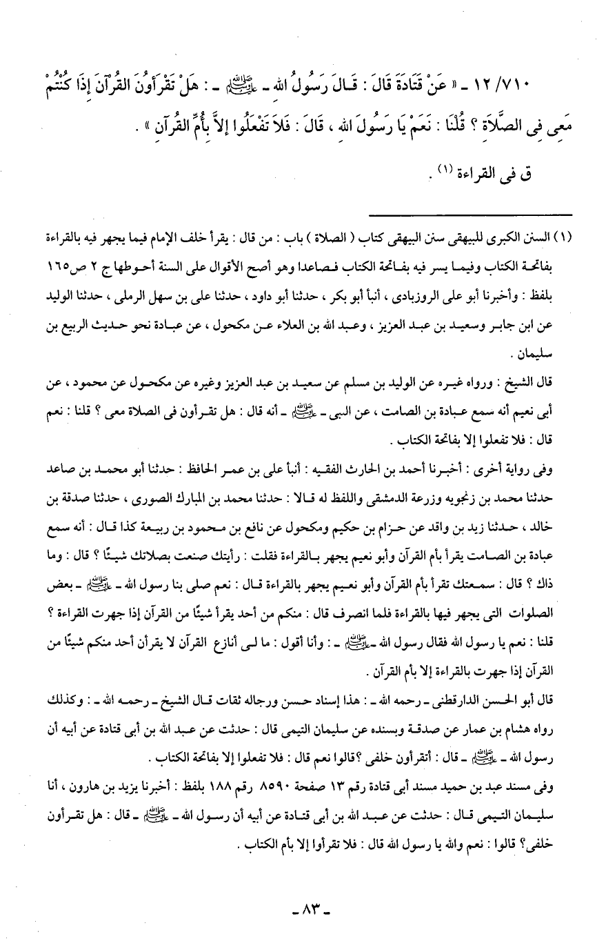 قال أبو الحسن الدارقطنى -رحمه اللَّه-: هذا إسناد حسن ورجاله ثقات قال الشيخ -رحمه اللَّه-: وكذلك رواه هشام بن عمار عن صدقة وبسنده عن سليمان التيمى قال: حدثت عن عبد اللَّه بن أَبى قتادة عن أبيه أن رسول اللَّه -صلى اللَّه عليه وسلم- قال: أتقرأون خلفى؟ قالوا نعم قال: فلا تفعلوا إلا بفاتحة الكتاب.