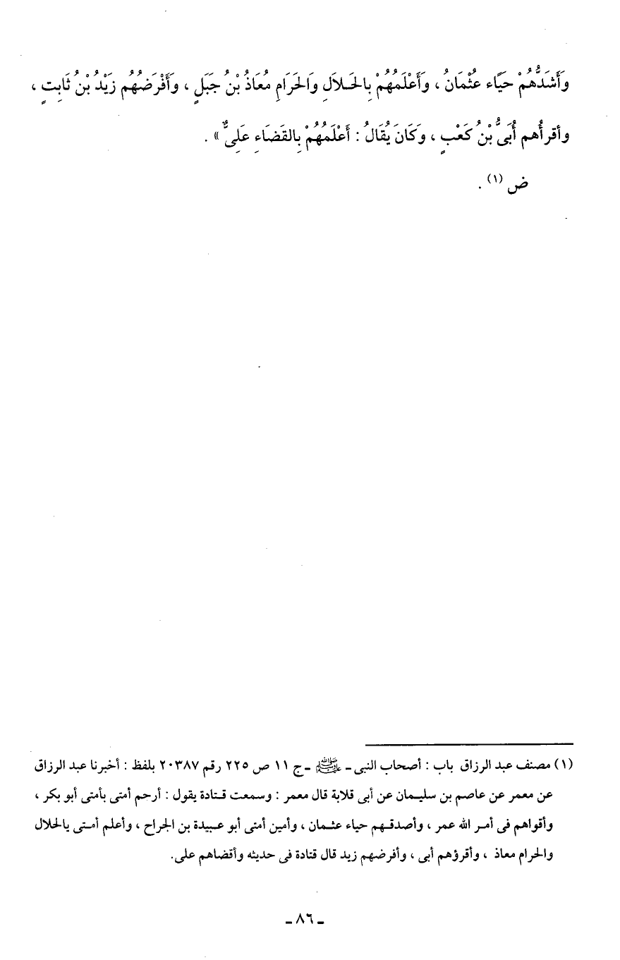 (¬1) مصنف عبد الرزاق باب: أصحاب النبى -صلى اللَّه عليه وسلم- جـ 11 ص 225 رقم 20387 بلفظ: أخبرنا عبد الرزاق عن معمر عن عاصم بن سليمان عن أَبى قلابة قال معمر: وسمعت قتادة يقول: أرحم أمتى بأمتى أبو بكر، وأقواهم في أمر اللَّه عمر، وأصدقهم حياء عثمان، وأمين أمتى أبو عبيدة بن الجراح، وأعلم أمتى بالحلال والحرام معاذ، وأقرؤهم أَبى، وأفرضهم زيد قال قتادة في حديثه وأقضاهم على.