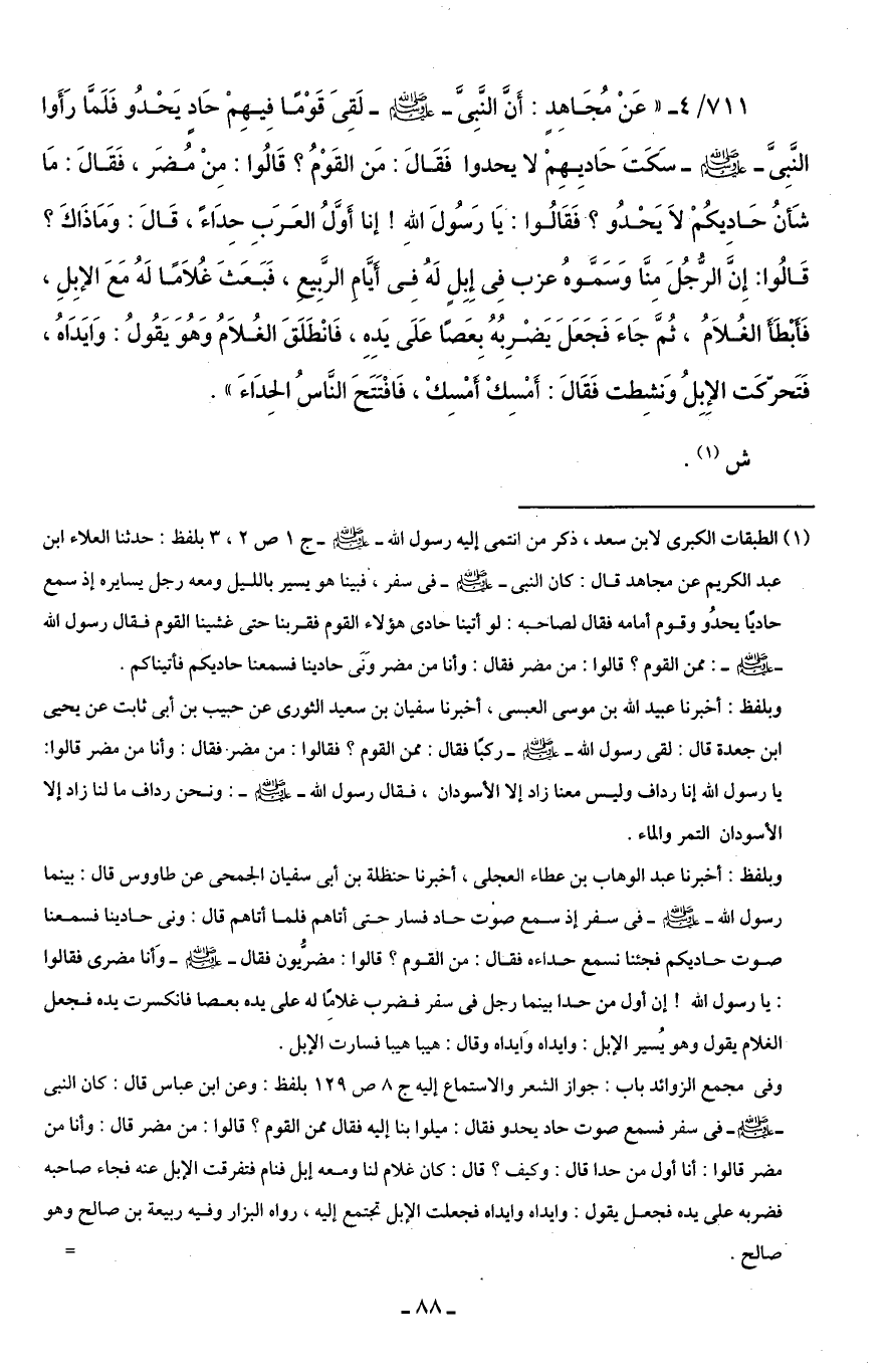 711/ 4 - "عَنْ مُجَاهِدٍ: أَنَّ النَّبِىَّ -صلى اللَّه عليه وسلم- لَقِى قَوْمًا فِيهِمْ حَادٍ يَحْدُو فَلَمَّا رَأَوا النَّبِىَّ -صلى اللَّه عليه وسلم- سَكَتَ حَاديِهِمْ لا يحدوا فَقَالَ: مَن القَوْمُ؟ قَالُوا: مِنْ مُضَر، فَقَالَ: مَا شَأنُ حَادِيكُمْ لَا يَحْدُو؟ فَقَالُوا: يَا رَسُولَ اللَّهِ! إنا أَوَّلُ العَرَبِ حِدَاءً، قَالَ: وَمَا ذَاكَ؟ قَالُوا: إِنَّ الرَّجُلَ مِنَّا وَسَمَّوهُ عزب فِى إِبِلٍ لَهُ فِى أَيَّامِ الرَّبِيعِ، فَبَعَثَ غُلَامًا لَهُ مَعَ الإبِلِ، فَأَبْطأَ الغُلَامُ، ثُمَّ جَاءَ فَجَعَلَ يَضْرِبُهُ بِعَصًا عَلَى يَدِهِ، فَانْطَلَقَ الغُلَامُ وَهُوَ يَقُولُ: وَايَدَاهُ، فَتَحرّكَت الإِبِلُ وَنشِطت فَقَالَ: أَمْسِكْ أَمْسِكْ، فَافْتَتَحَ النَّاسُ الحِدَاءَ".