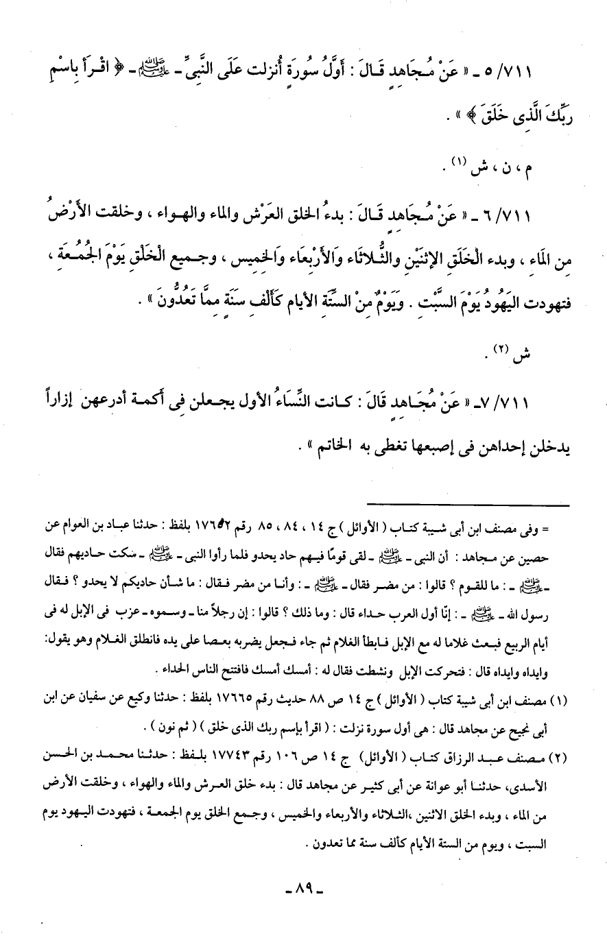 (¬2) مصنف عبد الرزاق كتاب (الأوائل) جـ 14 ص 106 رقم 17743 بلفظ: حدثنا محمد بن الحسن الأسدى، حدثنا أبو عوانة عن أَبى كثير عن مجاهد قال: بدء خلق العرش والماء والهواء، وخلقت الأرض من الماء، وبدء الخلق الاثنين، الثلاثاء والأربعاء والخميس، وجمع الخلق يوم الجمعة، فتهودت اليهود يوم السبت، ويوم من الستة الأيام كألف سنة مما تعدون.