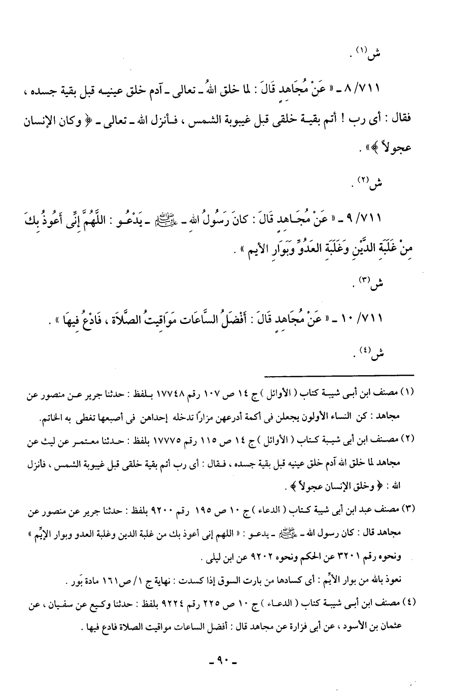 (¬4) مصنف ابن أبى شيبة كتاب (الدعاء) جـ 10 ص 225 رقم 9224 بلفظ: حدثنا وكيع عن سفيان، عن عثمان بن الأسود، عن أَبى فزارة عن مجاهد قال: أفضل الساعات مواقيت الصلاة فادع فيها.
