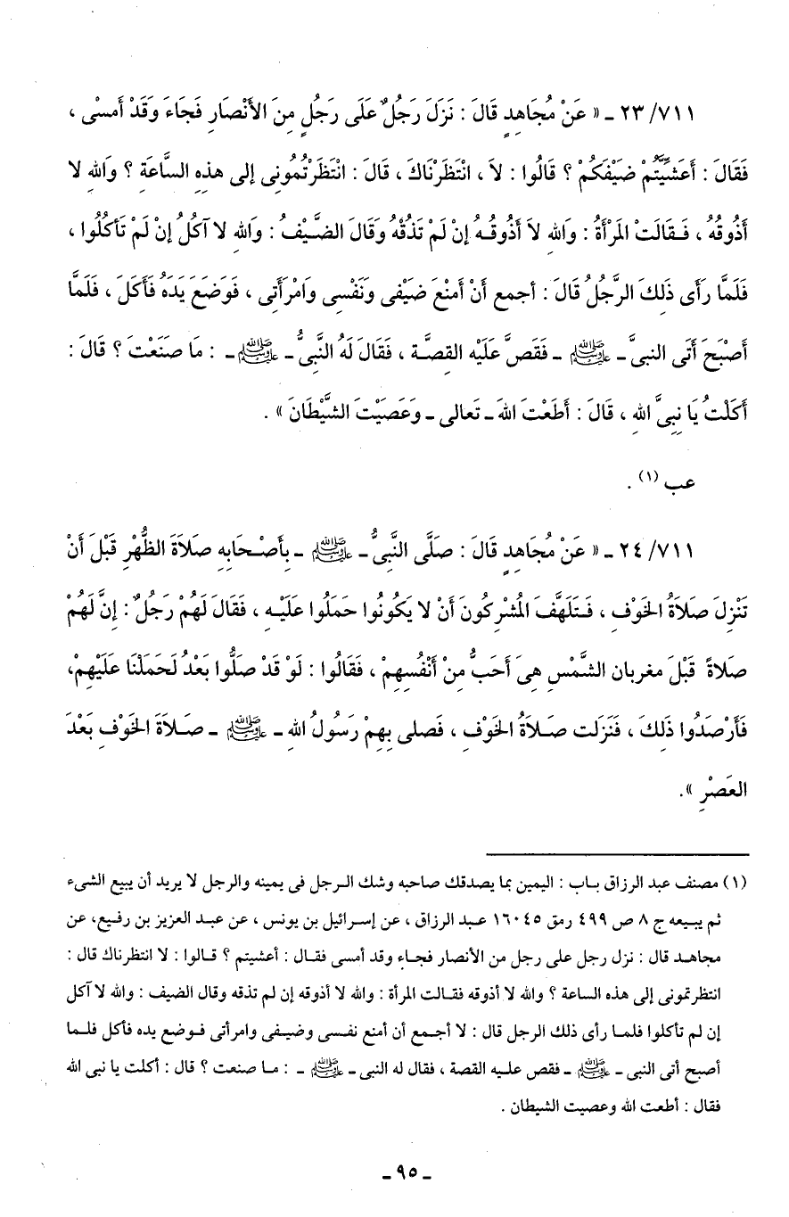 711/ 23 - "عَنْ مُجَاهِدٍ قَالَ: نَزَلَ رَجُلٌ عَلَى رَجُلٍ مِنَ الأَنْصَارِ فَجَاءَ وَقَدْ أَمسى، فَقَالَ: أَعَشِّيَّتُمْ ضَيْفَكُمْ؟ قَالُوا: لَا، انْتَظَرْنَاكَ، قَالَ: انْتَظَرْتُمُونِى إلى هذِهِ السَّاعَةِ؟ وَاللَّهِ لا أَذُوقُهُ، فَقَالَتْ المَرْأَةُ: وَاللَّهِ لَا أَذُوقُهُ إن لَمْ تَذُقْهُ وَقَالَ الضَّيْفُ: وَاللَّهِ لا آكُلُ إنْ لَمْ تَأكُلُوا، فَلَمَّا رَأَى ذَلِكَ الرَّجُلُ قَالَ: أجمع أَنْ أَمنْعَ ضَيْفى وَنَفسِى وَامْرَأَتِى، فَوَضَعَ يَدَهُ فَأَكَلَ، فَلَمَّا أَصْبَحَ أَتَى النبىَّ -صلى اللَّه عليه وسلم- فَقَصَّ عَلَيْه القِصَّة، فَقَالَ لَهُ النَّبِىُّ -صلى اللَّه عليه وسلم-: مَا صَنَعْتَ؟ قَالَ: أَكَلْتُ يَا نَبِىَّ اللَّهِ، قَالَ: أَطَعْتَ اللَّهَ -تَعالى- وَعَصَيْتَ الشَّيْطَانَ".