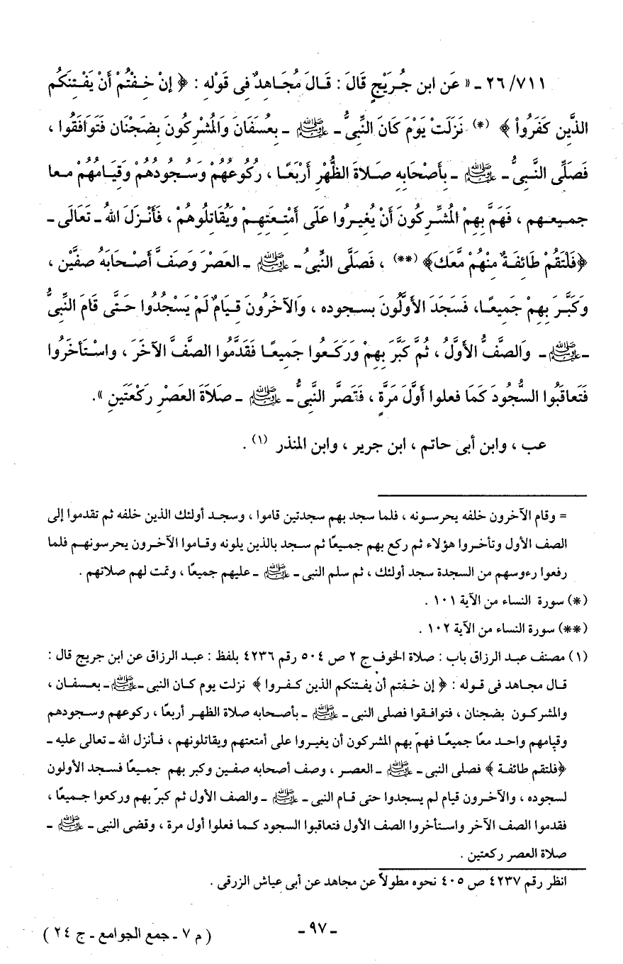 711/ 26 - "عَن ابن جُرَيْجٍ قَالَ: قَالَ مُجَاهِدٌ فِى قَوْلهِ: {إِنْ خِفْتُمْ أَنْ يَفْتِنَكُمُ الَّذِينَ كَفَرُوا} (*) نَزَلَتْ يَوْمَ كَانَ النِّبِىُّ -صلى اللَّه عليه وسلم- بِعُسَفَانَ وَالمُشْرِكُونَ بِضَجْنَان فَتَوَافَقُوا، فَصَلَّى النَّبِىُّ -صلى اللَّه عليه وسلم- بِأَصْحَابِهِ صَلاةَ الظُّهْرِ أَرْبَعًا، رُكُوعُهُمْ وَسُجُودُهُمْ وَقِيَامُهُمْ معا جميعهم، فَهَمَّ بِهِمْ المُشِّرِكُونَ أَنْ يُغِيرُوا عَلى أَمْتِعَتِهِمْ وَيُقَاتِلُوهُمْ، فَأَنْزَلَ اللَّهُ -تَعَالَى- {فَلْتَقُمْ طَائِفَةٌ مِنْهُمْ مَعَكَ} (* *)، فَصَلَّى النَّبىُّ -صلى اللَّه عليه وسلم- العَصْرَ وَصَفَّ أَصْحَابَهُ صفَّيْن، وَكَبَّرَ بِهمْ جَمِيعًا، فَسَجَدَ الأَوَّلُونَ بسجوده، وَالآخَرُونَ قِيَامٌ لَمْ يَسْجُدُوا حَتَّى قَامَ النَّبِىُّ -صلى اللَّه عليه وسلم- وَالصَّفُّ الأَوَّلُ، ثُمَّ كَبَّرَ بِهِمْ وَرَكَعُوا جَمِيعًا فَقَدَّمُوا الصَّفَّ الآخَرَ، واسْتَأخَرُوا فَتَعاقَبُوا السُّجُودَ كَمَا فعلوا أَوَّلَ مَرَّةٍ، فَقَصَّر النَّبِىُّ -صلى اللَّه عليه وسلم- صَلَاةَ العَصْرِ رَكْعَتَينِ".
