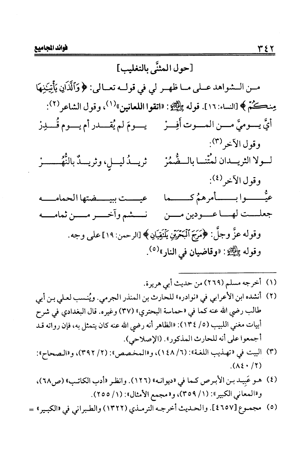 من الشواهد على ما ظهر لي في قوله تعالى: {وَاللَّذَانِ يَأْتِيَانِهَا مِنْكُمْ} [النساء: ١٦]. قوله - صلى الله عليه وآله وسلم -: «اتقوا اللعانين» (¬١)، وقول الشاعر (¬٢):