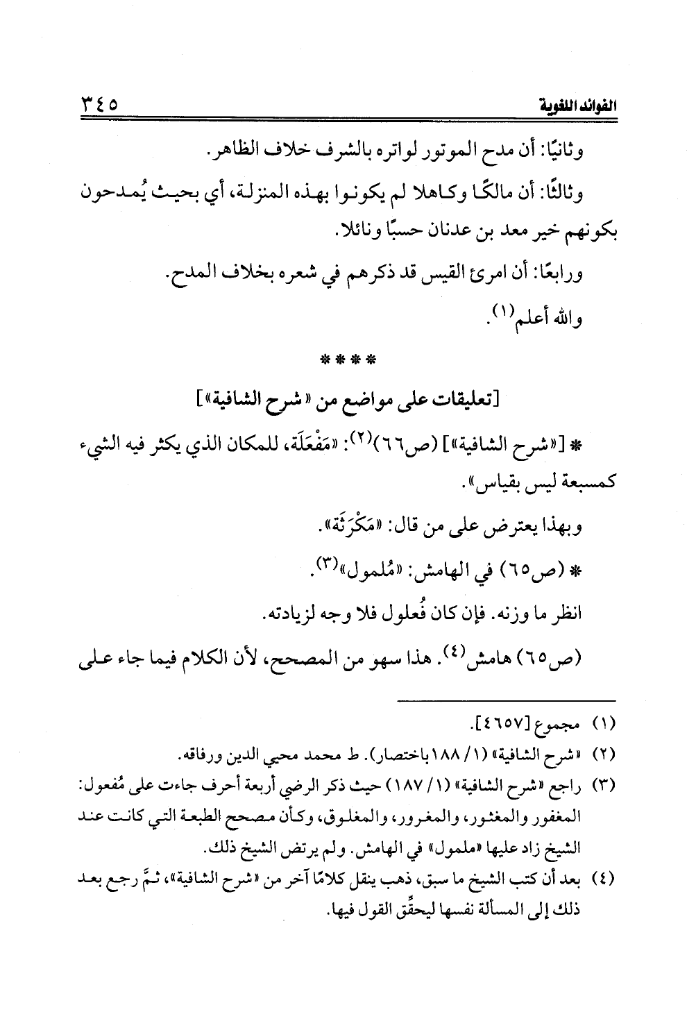 (¬٤) بعد أن كتب الشيخ ما سبق، ذهب ينقل كلامًا آخر من «شرح الشافية»، ثمَّ رجع بعد ذلك إلى المسألة نفسها ليحقِّق القول فيها.
