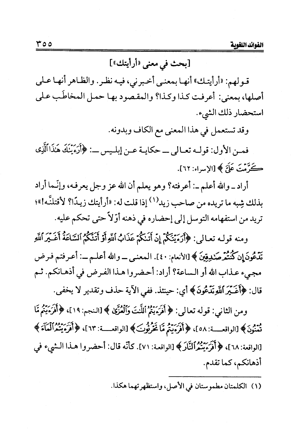 ومن الثاني: قوله تعالى: {أَفَرَأَيْتُمُ اللَّاتَ وَالْعُزَّى} [النجم: ١٩]، {أَفَرَأَيْتُمْ مَا تُمْنُونَ} [الواقعة: ٥٨]، {أَفَرَأَيْتُمْ مَا تَحْرُثُونَ} [الواقعة: ٦٣]، {أَفَرَأَيْتُمُ الْمَاءَ} [الواقعة: ٦٨]، {أَفَرَأَيْتُمُ النَّارَ} [الواقعة: ٧١]. كأنّه قال: أحضروا هذا الشيء في أذهانكم، كما تقدم.