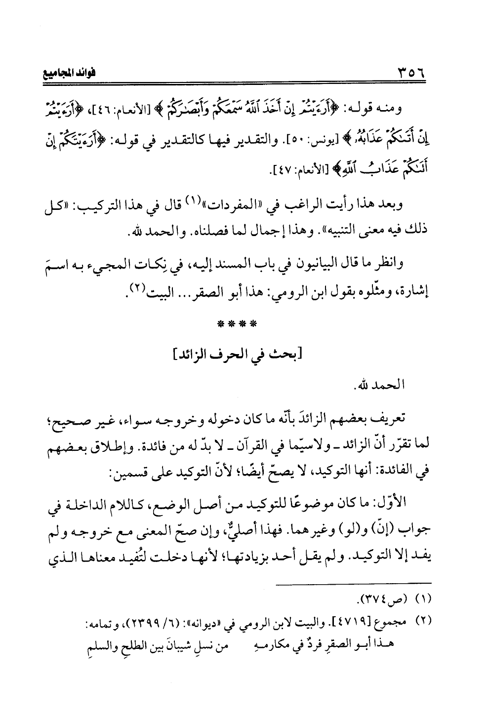 تعريف بعضهم الزائدَ بأنّه ما كان دخوله وخروجه سواء، غير صحيح؛ لما تقرّر أنّ الزائد ــ ولاسيّما في القرآن ــ لا بدّ له من فائدة. وإطلاق بعضهم في الفائدة: أنها التوكيد، لا يصحّ أيضًا؛ لأنّ التوكيد على قسمين: