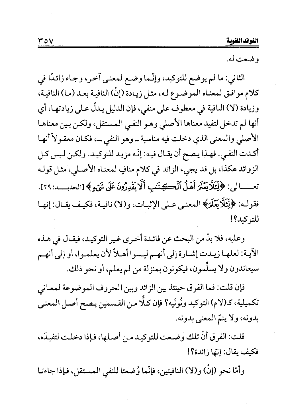 الثاني: ما لم يوضع للتوكيد، وإنّما وضع لمعنى آخر، وجاء زائدًا في كلام موافق لمعناه الموضوع له، مثل زيادة (إنْ) النافية بعد (ما) النافية، وزيادة (لا) النافية في معطوف على منفي، فإن الدليل يدلّ على زيادتها، أي أنها لم تدخل لتفيد معناها الأصلي وهو النفي المستقل، ولكن بين معناها الأصلي والمعنى الذي دخلت فيه مناسبة ــ وهو النفي ــ، فكان معقولاً أنها أكدت النفي. فهذا يصح أن يقال فيه: إنّه مزيد للتوكيد. ولكن ليس كل الزوائد هكذا، بل قد يجيء الزائد في كلام منافٍ لمعناه الأصلي، مثل قوله تعالى: {لِئَلَّا يَعْلَمَ أَهْلُ الْكِتَابِ أَلَّا يَقْدِرُونَ عَلَى شَيْءٍ} [الحديد: ٢٩]. فقوله: {لِئَلَّا يَعْلَمَ} المعنى على الإثبات، و (لا) نافية، فكيف يقال: إنها للتوكيد؟ !