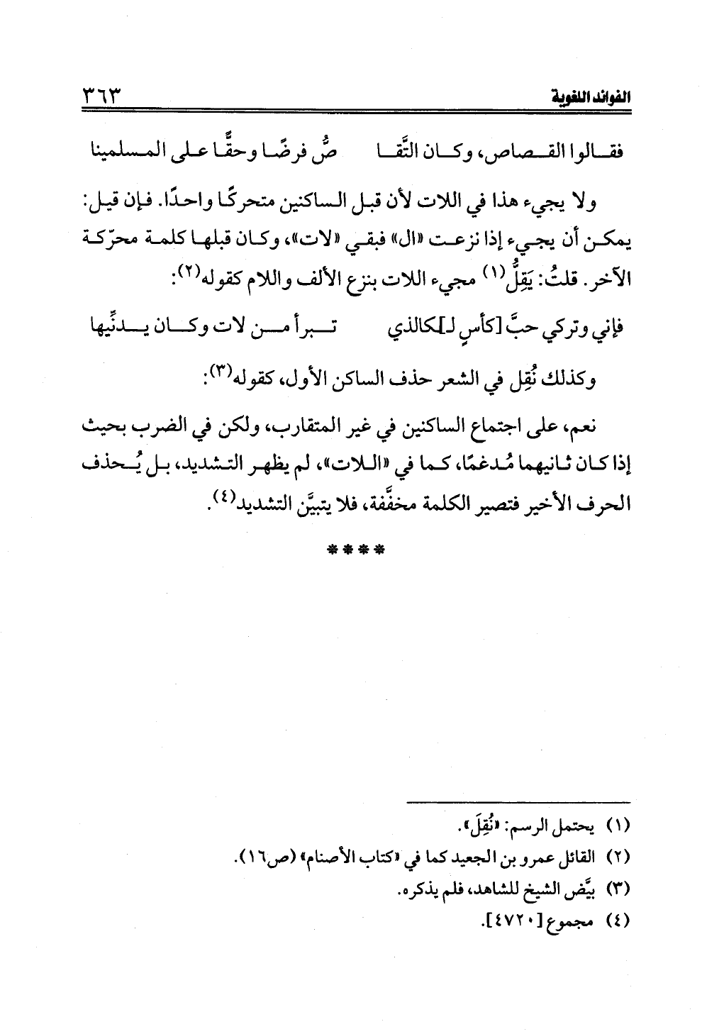ولا يجيء هذا في اللات لأن قبل الساكنين متحركًا واحدًا. فإن قيل: يمكن أن يجيء إذا نزعت «ال» فبقي «لات»، وكان قبلها كلمة محرّكة الآخر. قلتُ: يَقِلُّ (¬١) مجيء اللات بنزع الألف واللام كقوله (¬٢):