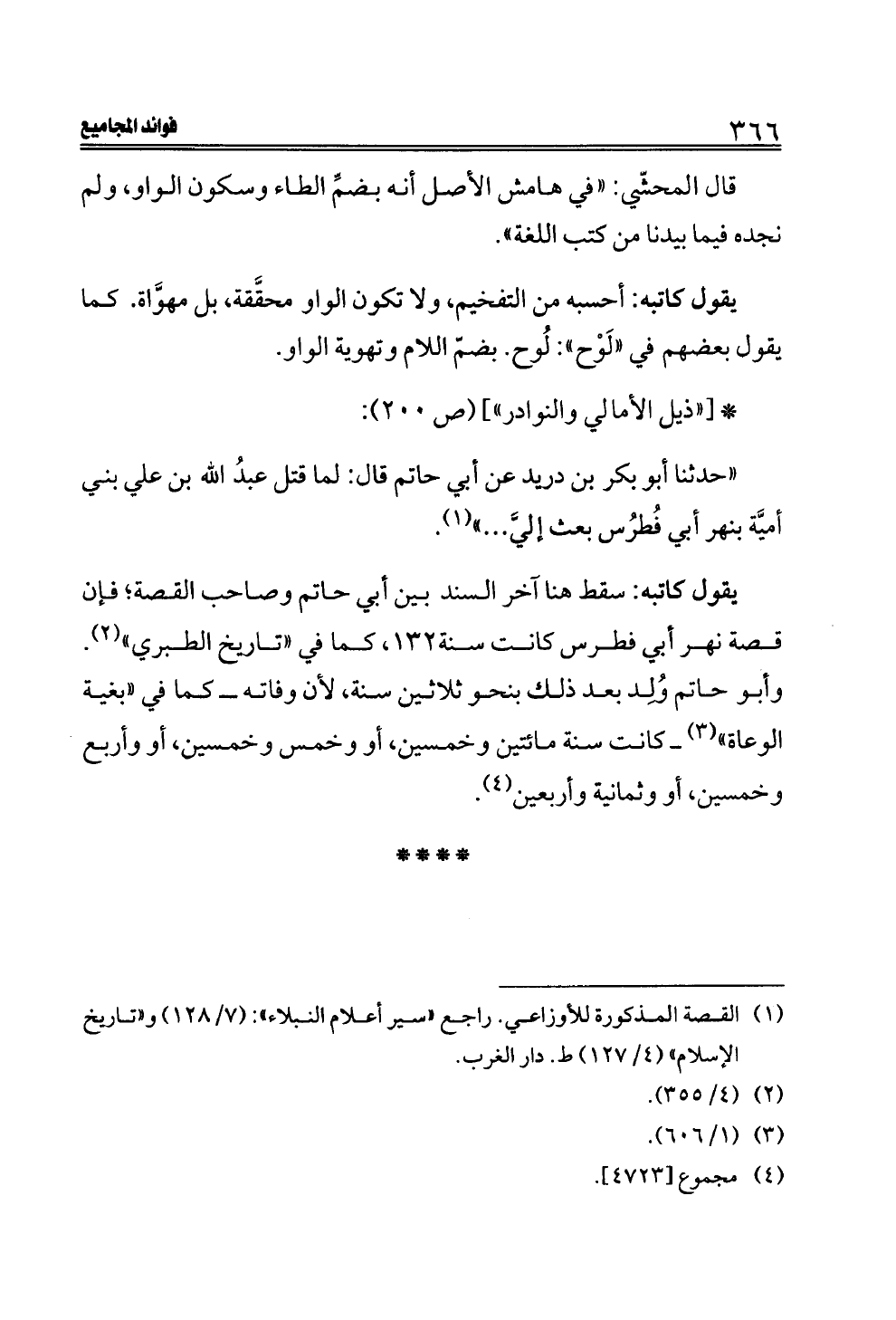 يقول كاتبه: سقط هنا آخر السند بين أبي حاتم وصاحب القصة؛ فإن قصة نهر أبي فطرس كانت سنة ١٣٢، كما في «تاريخ الطبري» (¬٢). وأبو حاتم وُلِد بعد ذلك بنحو ثلاثين سنة، لأن وفاته ــ كما في «بغية الوعاة» (¬٣) ــ كانت سنة مائتين وخمسين، أو وخمس وخمسين، أو وأربع وخمسين، أو وثمانية وأربعين (¬٤).