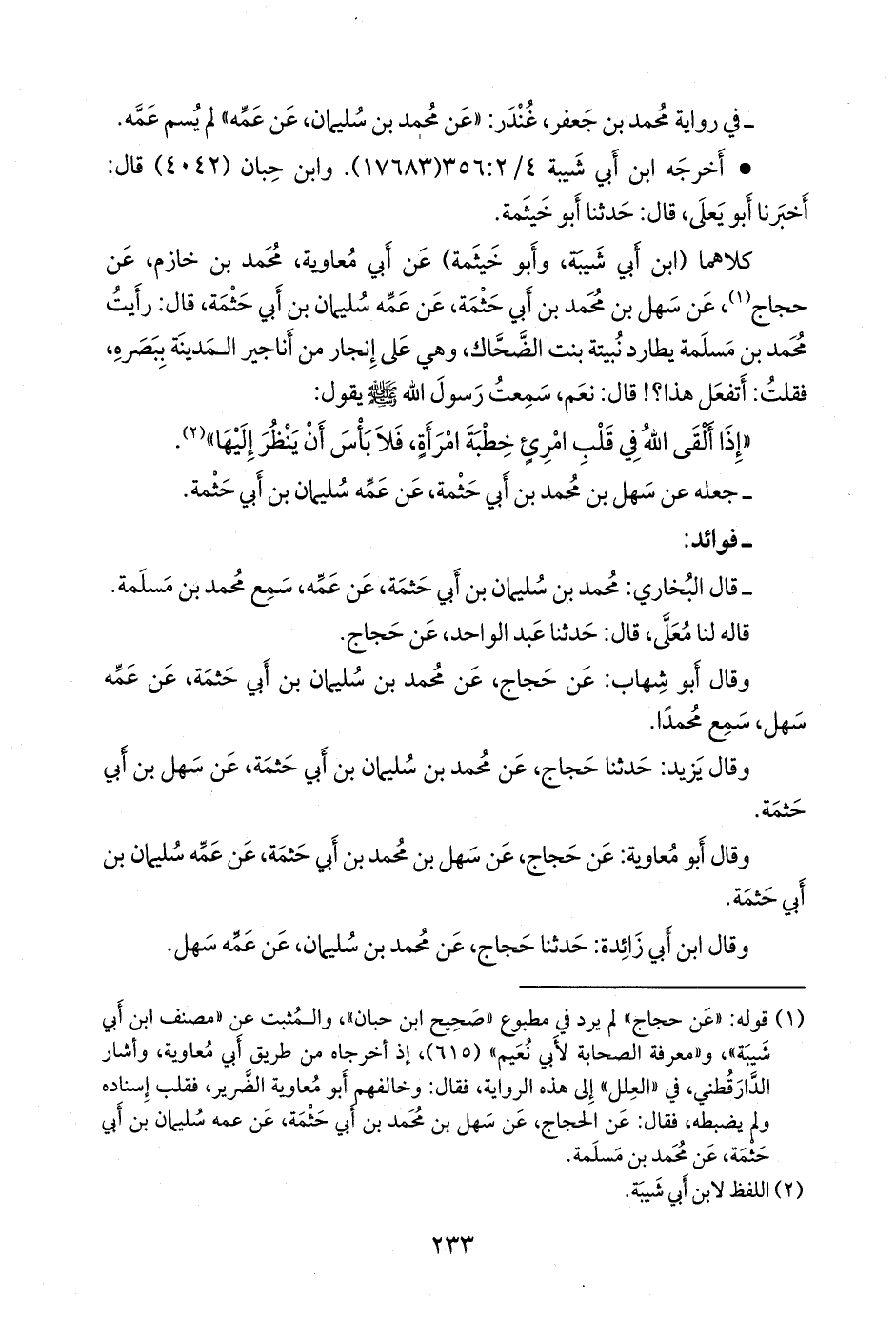 حدثني محمد، قال: أخبرنا عبد الله، قال: أخبرنا حجاج، عن ابن سليمان بن أبي حثمة، عن سهل بن أبي حثمة، سمع محمد بن مَسلَمة. «التاريخ الكبير» ١/ ٩٦.
