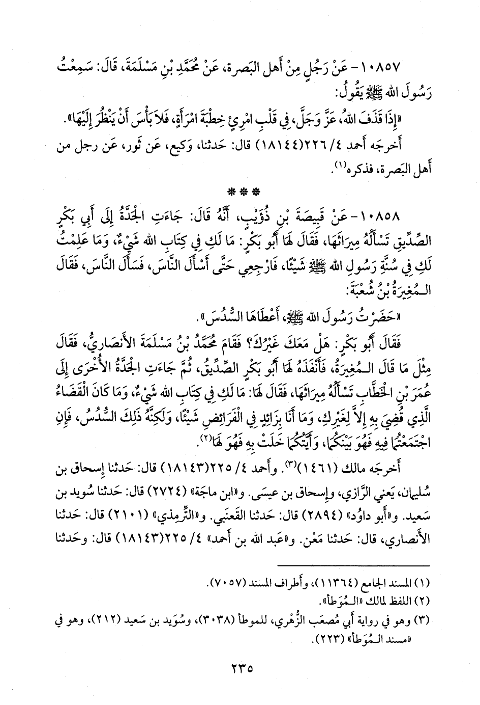 ١٠٨٥٨ - عن قَبيصَة بن ذؤيب، أنه قال: جاءت الجدة إلى أَبي بكر الصِّدِّيق تسأله ميراثها، فقال لها أَبو بكر: ما لك في كتاب الله شيء، وما علمت لك في سنة رسول الله صَلى الله عَليه وسَلم شيئا، فارجعي حتى أسأل الناس، فسأل الناس، فقال المغيرة بن شعبة: