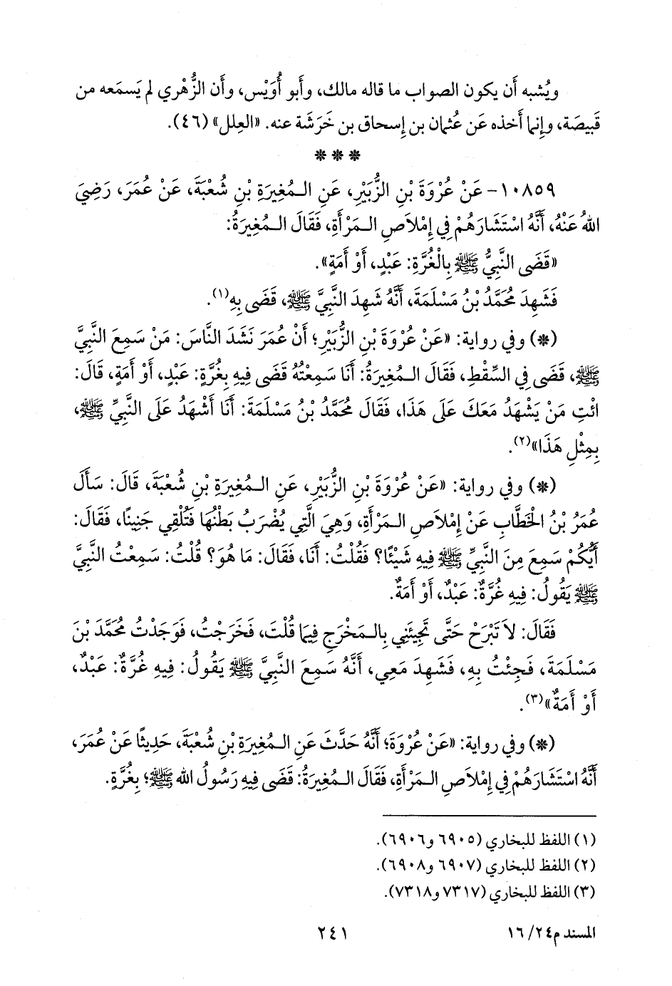 - وفي رواية: «عن عروة بن الزبير، عن المغيرة بن شعبة، قال: سأل عمر بن الخطاب عن إملاص المرأة، وهي التي يضرب بطنها فتلقي جنينا، فقال: أيكم سمع من النبي صَلى الله عَليه وسَلم فيه شيئا؟ فقلت: أنا، فقال: ما هو؟ قلت: سمعت النبي صَلى الله عَليه وسَلم يقول: فيه غرة: عبد، أو أمة.