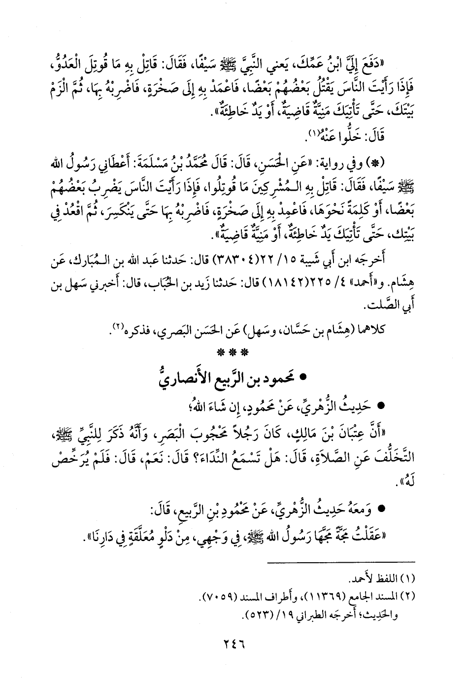 - وقال البخاري: محمود بن الربيع، الخَزرَجي الأَنصاري، أَدرك النبي صَلى الله عَليه وسَلم. «التاريخ الكبير» ٧/ ٤٠٢.