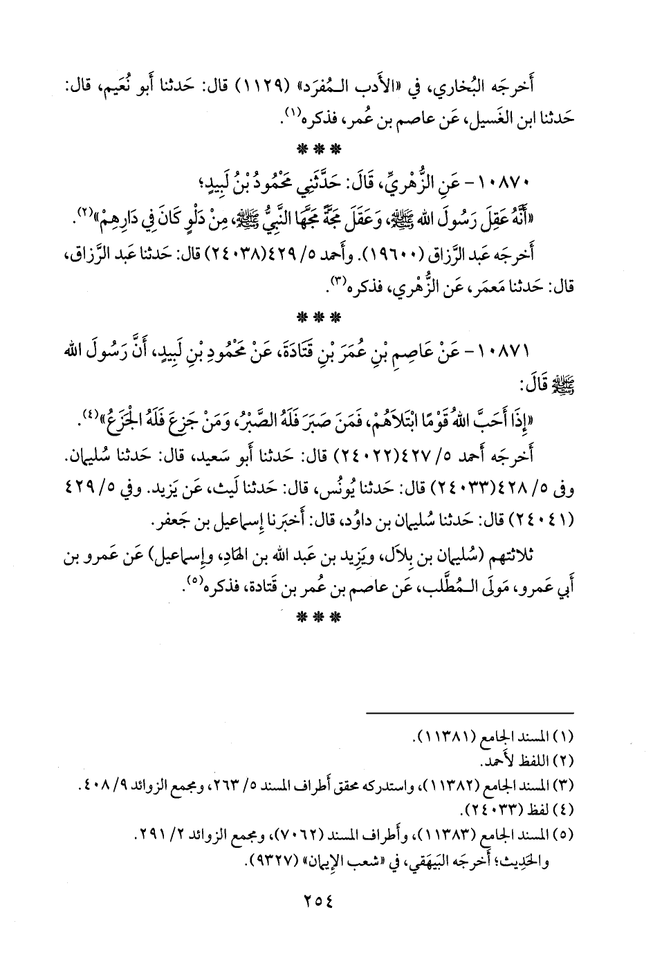 ١٠٨٧٠ - عن محمد بن مسلم بن شهاب الزُّهْري، قال: حدثني محمود بن لَبيد؛