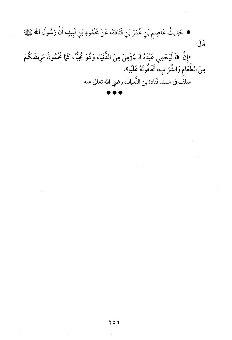 «إن الله، عز وجل، ليحمي عبده المؤمن من الدنيا، وهو يحبه، كما تحمون مريضكم من الطعام والشراب، تخافونه عليه».