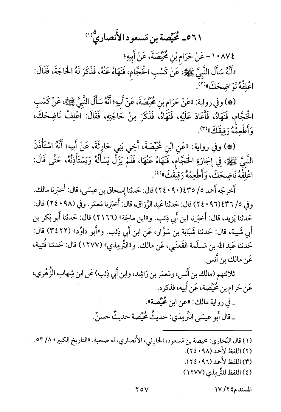 - وفي رواية: «عن ابن مُحَيِّصَة أَحد بني حارثة، عن أَبيه، أَنه استأذن رسول الله صَلى الله عَليه وسَلم في إِجارة الحجام، فنهاه عنه، فلم يزل يسأَله ويستأذنه، حتى قال: اعلفه ناضحك، أَو أَطعمه رقيقك» (¬٣).