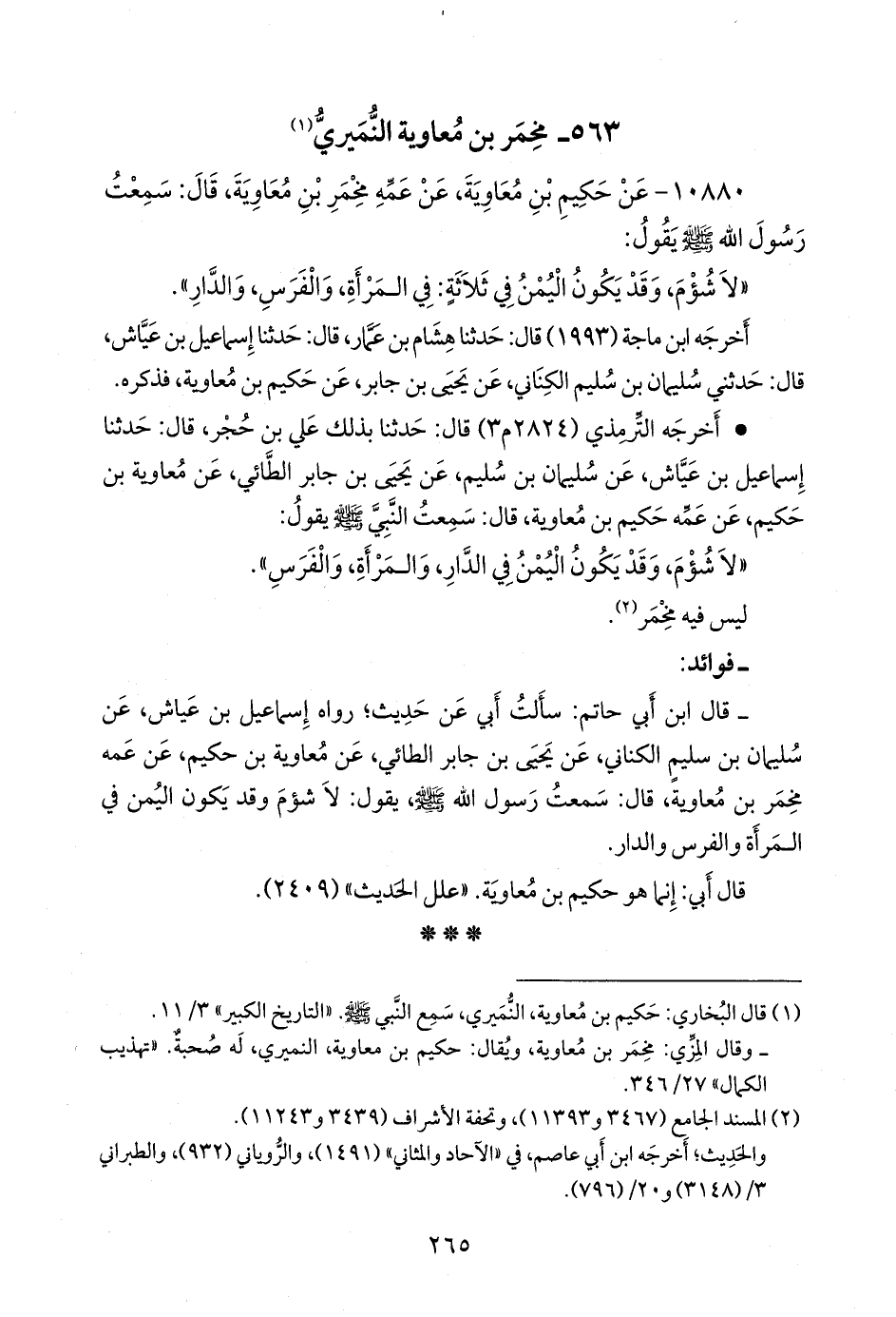 - وقال ابن أبي حاتم: سألتُ أبي عن حديثٍ؛ رواه إسماعيل بن عياش، عن سليمان بن سليم الكناني، عن يحيى بن جابر الطائي، عن معاوية بن حكيم، عن عمه مخمر بن معاوية، قال: سمعت رسول الله صَلى الله عَليه وسَلم يقول: لا شؤم وقد يكون اليمن في المرأة والفرس والدار.