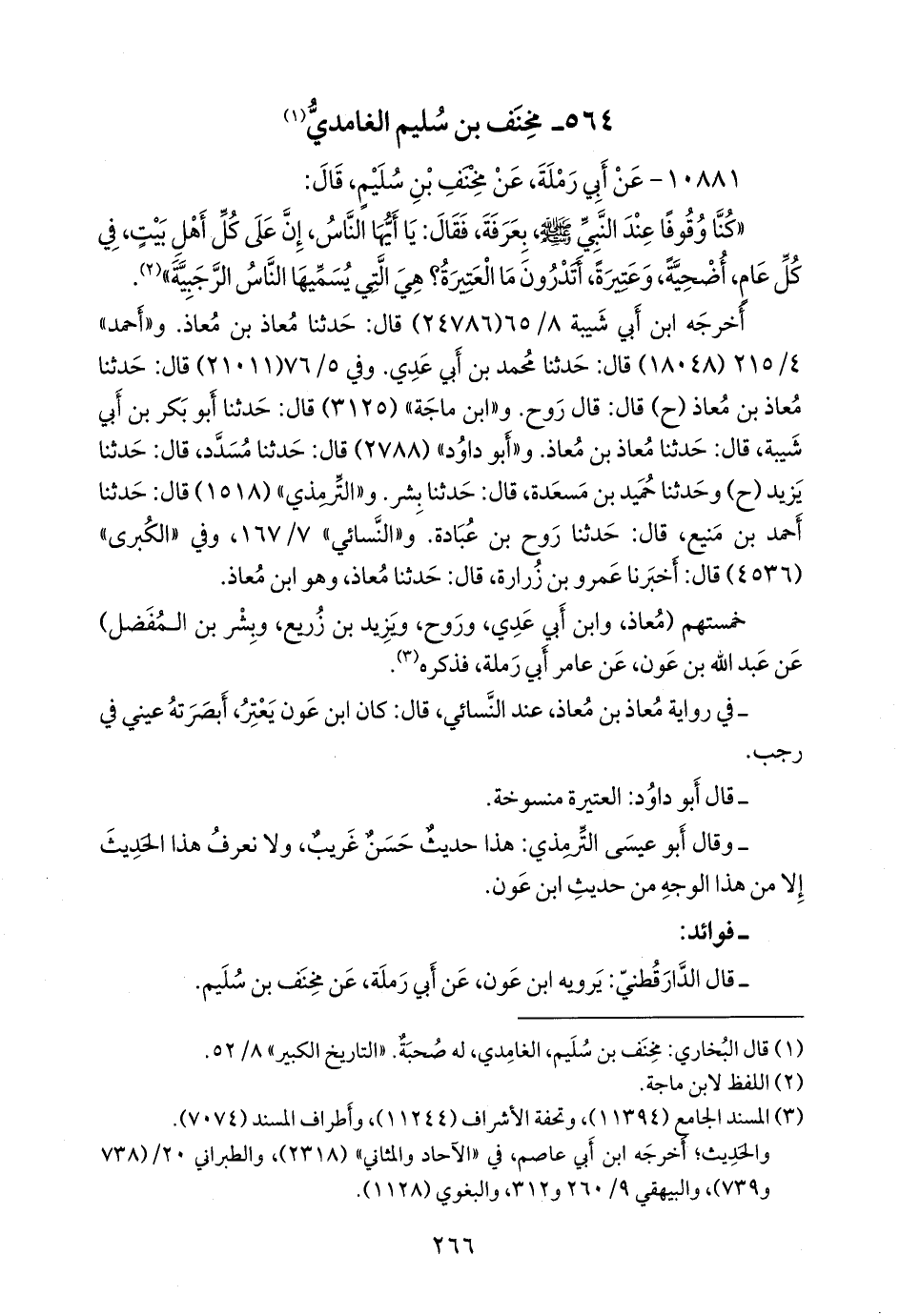 «ونحن وقوف مع رسول الله صَلى الله عَليه وسَلم بعرفات, قال: قال: يا أَيها الناس, إِن على كل أَهل بيت في كل عام أُضحية وعتيرة, أَتدرون ما العتيرة؟ هذه التي يقول الناس: الرجبية» (¬٢).