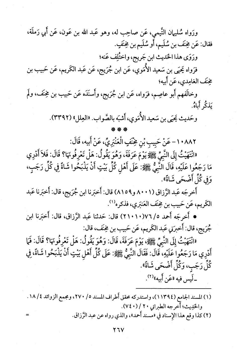 «انتهيت إلى النبي صَلى الله عَليه وسَلم يوم عرفة، قال: وهو يقول: هل تعرفونها؟ قال: فما أدري ما رجعوا عليه، قال: فقال النبي صَلى الله عَليه وسَلم: على كل أهل بيت أن يذبحوا شاة، في كل رجب، وكل أضحى شاة».
