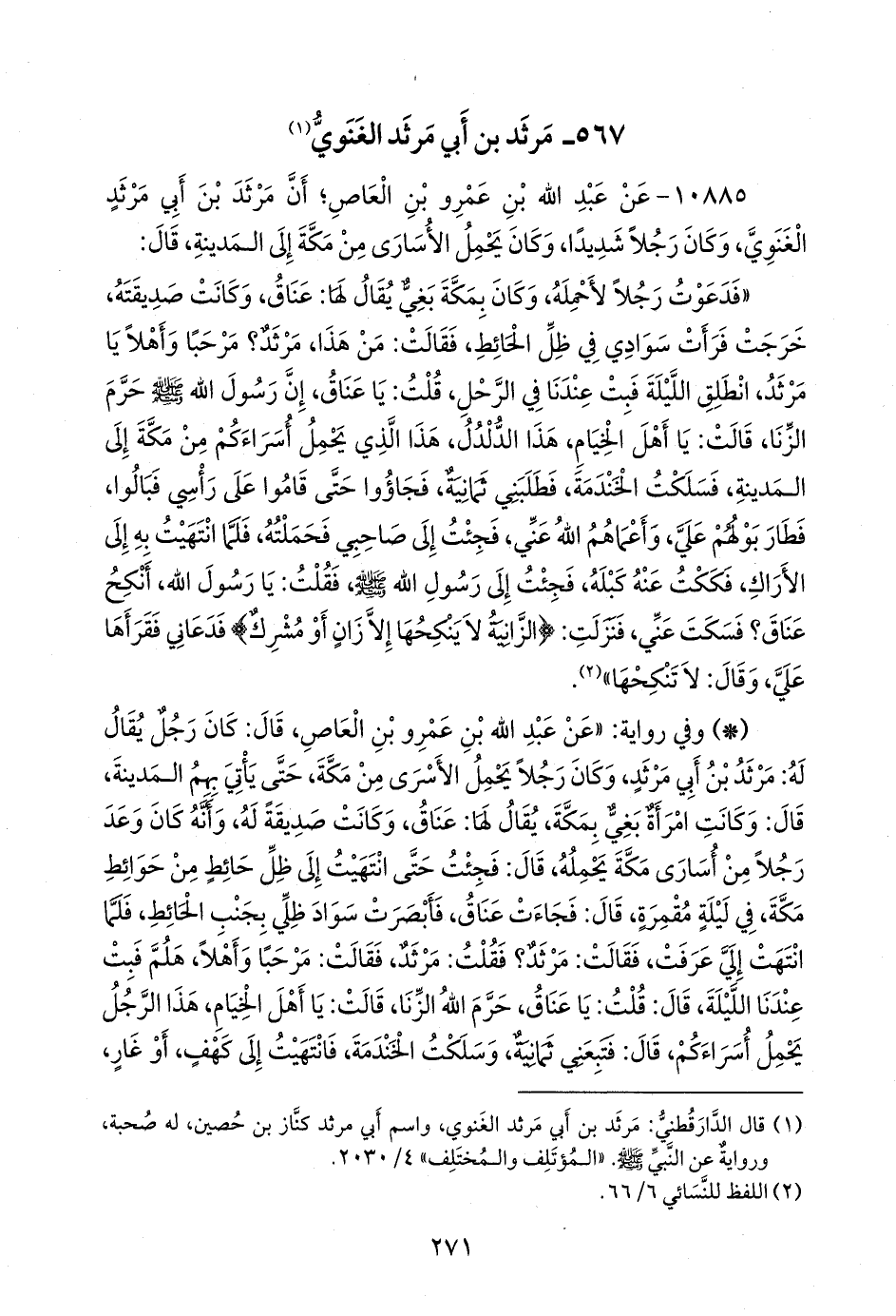 - وفي رواية: «عن عبد الله بن عَمرو بن العاص، قال: كان رجل يقال له: مَرثد بن أبي مَرثد، وكان رجلا يحمل الأسرى من مكة، حتى يأتي بهم المدينة، قال: وكانت امرأة بغي بمكة، يقال لها: عناق، وكانت صديقة له، وأنه كان وعد رجلا من أسارى مكة يحمله، قال: فجئت حتى انتهيت إلى ظل حائط من حوائط مكة، في ليلة مقمرة، قال: فجاءت عناق، فأبصرت سواد ظلي بجنب الحائط، فلما انتهت إلي عرفت، فقالت: مَرثد؟ فقلت: مَرثد،