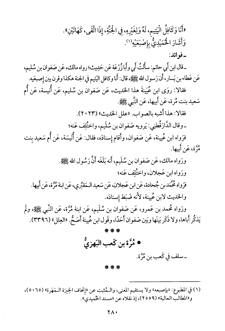 - قال عبد الرَّحمَن بن أبي حاتم الرازي: سألت أبي وأَبا زُرعَة عن حديث؛ رواه مالك، عن صفوان بن سليم، عن عطاء بن يسار، أن رسول الله صَلى الله عَليه وسَلم قال: أنا وكافل اليتيم في الجنة هكذا وقرن بين إصبعيه.