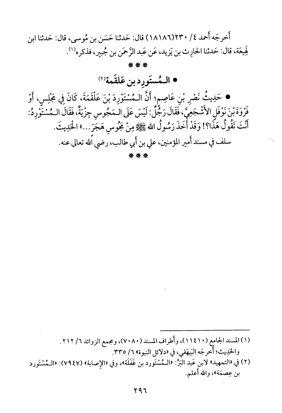 • حديث نصر بن عاصم؛ أن المستورد بن علقمة، كان في مجلس، أو فروة بن نوفل الأشجعي، فقال رجل: ليس على المجوس جزية، فقال المستورد: أنت تقول هذا؟! وقد أخذ رسول الله صَلى الله عَليه وسَلم من مجوس هجر» الحديثَ.