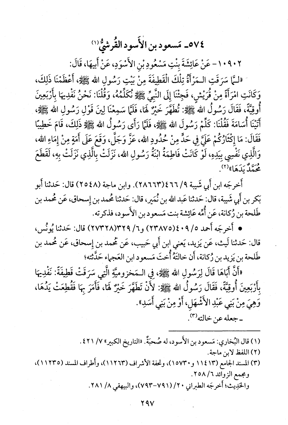 «أن أباها قال لرسول الله صَلى الله عَليه وسَلم في المخزومية التي سرقت قطيفة: نفديها بأربعين أوقية، فقال رسول الله صَلى الله عَليه وسَلم: لأن تطهر خير لها، فأمر بها فقطعت يدها، وهي من بني عبد الأشهل، أو من بني أسد».