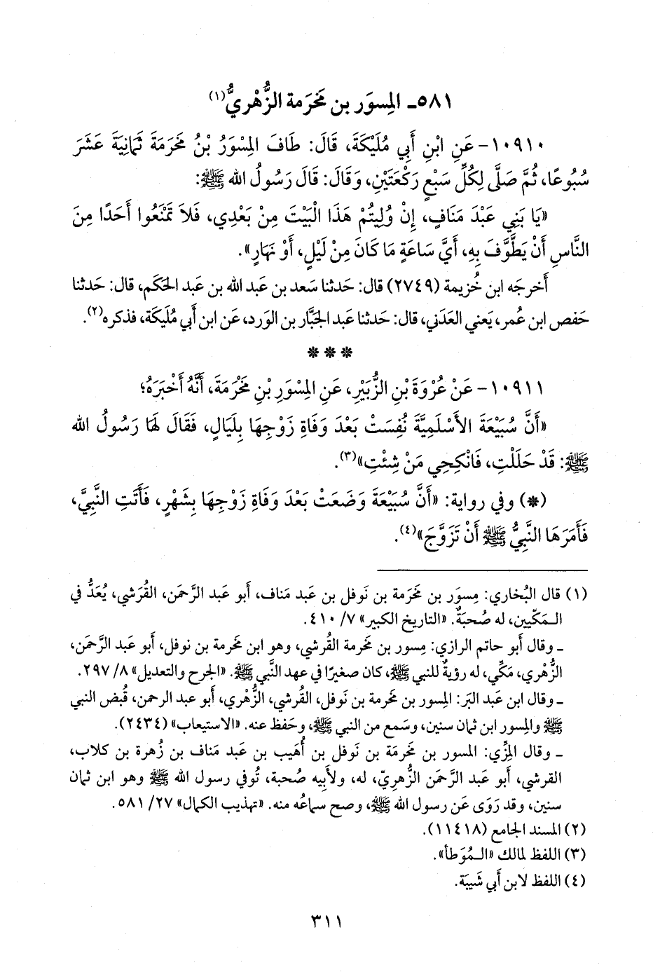 (¬١) قال البخاري: مسور بن مخرمة بن نوفل بن عبد مناف، أَبو عبد الرَّحمَن، القرشي، يعد في المكيين، له صحبة. «التاريخ الكبير» ٧/ ٤١٠.