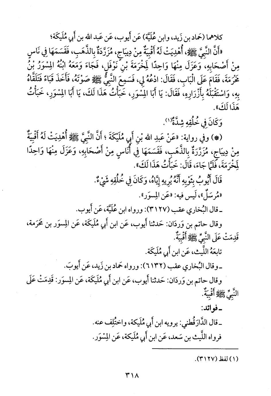 وقال حاتم بن وَردان: حدثنا أيوب، عن ابن أَبي مُليكة، عن المسور بن مخرمة، قدمت على النبي صَلى الله عَليه وسَلم أقبية.