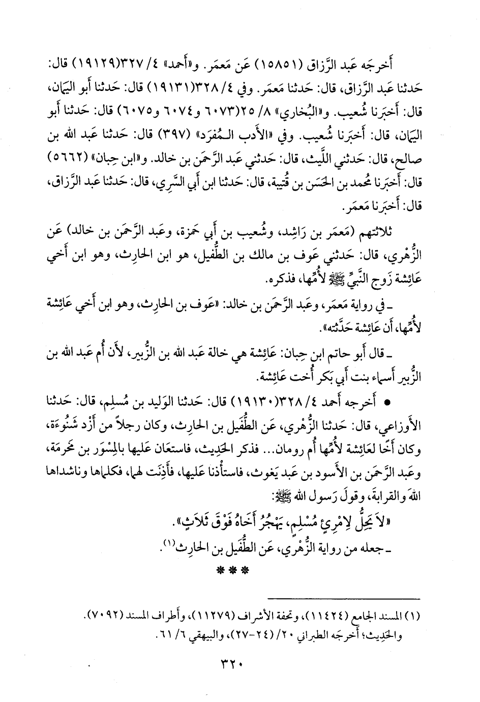 ثلاثتهم (مَعمَر بن راشد، وشعيب بن أبي حمزة، وعبد الرَّحمَن بن خالد) عن الزُّهْري، قال: حدثني عوف بن مالك بن الطفيل، هو ابن الحارث، وهو ابن أخي عائشة زوج النبي صَلى الله عَليه وسَلم لأمها، فذكره.