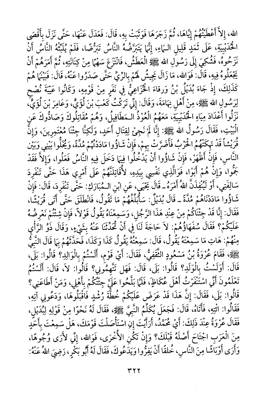 ثم زجرها فوثبت به، قال: فعدل عنها، حتى نزل بأقصى الحُدَيبيَة، على ثمد قليل الماء، إنما يتبرضه الناس تبرضا، فلم يلبثه الناس أن نزحوه، فشكي إلى رسول الله صَلى الله عَليه وسَلم العطش، فانتزع سهما من كنانته، ثم أمرهم أن يجعلوه فيه، قال: فوالله، ما زال يجيش لهم بالري حتى صدروا عنه، قال: فبينما هم كذلك، إذ جاء بديل بن ورقاء الخُزاعي في نفر من قومه، وكانوا عيبة نصح لرسول الله صَلى الله عَليه وسَلم من أهل تهامة، وقال: إني تركت كعب بن لؤي، وعامر بن لؤي، نزلوا أعداد مياه الحُدَيبيَة، معهم العوذ المطافيل، وهم مقاتلوك وصادوك عن البيت، فقال رسول الله صَلى الله عَليه وسَلم: إنا لم نجئ لقتال أحد، ولكنا جئنا معتمرين، وإن قريشا قد نهكتهم الحرب فأضرت بهم، فإن شاؤوا ماددتهم مدة، ويخلوا بيني وبين الناس، فإن أظهر، فإن شاؤوا أن يدخلوا فيما دخل فيه الناس فعلوا، وإلا فقد جموا، وإن هم أَبوا، فوالذي نفسي بيده، لأقاتلنهم على أمري هذا حتى تنفرد سالفتي، أو لينفذن الله أمره ـ قال يحيى، عن ابن المبارك: حتى تنفرد، قال: فإن شاؤوا ماددناهم مدة ـ قال بديل: سأبلغهم ما تقول، فانطلق حتى أتى قريشا، فقال: إنا قد جئناكم من عند هذا الرجل، وسمعناه يقول قولا، فإن شئتم نعرضه عليكم؟ فقال سفهاؤهم: لا حاجة لنا في أن تحدثنا عنه بشيء، وقال ذو الرأي منهم: هات ما سمعته يقول، قال: سمعته يقول كذا وكذا، فحدثهم بما قال النبي صَلى الله عَليه وسَلم فقام عروة بن مسعود الثقفي، فقال: أي قوم، ألستم بالوالد؟ قالوا: بلى، قال: أولست بالولد؟ قالوا: بلى، قال: فهل تتهموني؟ قالوا: لا، قال: ألستم تعلمون أني استنفرت أهل عكاظ، فلما بلحوا علي جئتكم بأهلي، ومن أطاعني؟ قالوا: بلى، فقال: إن هذا قد عرض عليكم خطة رشد فاقبلوها، ودعوني آته، فقالوا: ائته، فأتاه، قال: فجعل يكلم النبي صَلى الله عَليه وسَلم فقال له نحوا من قوله لبديل، فقال عروة عند ذلك: أي محمد، أرأيت إن استأصلت قومك، هل سمعتَ بأحد من العرب اجتاح أصله قبلك؟ وإن تكن الأخرى، فوالله، إني لأرى وجوها، وأرى أوباشا من الناس، خلقا أن يفروا ويدعوك، فقال له أَبو بكر، رضي الله عنه: