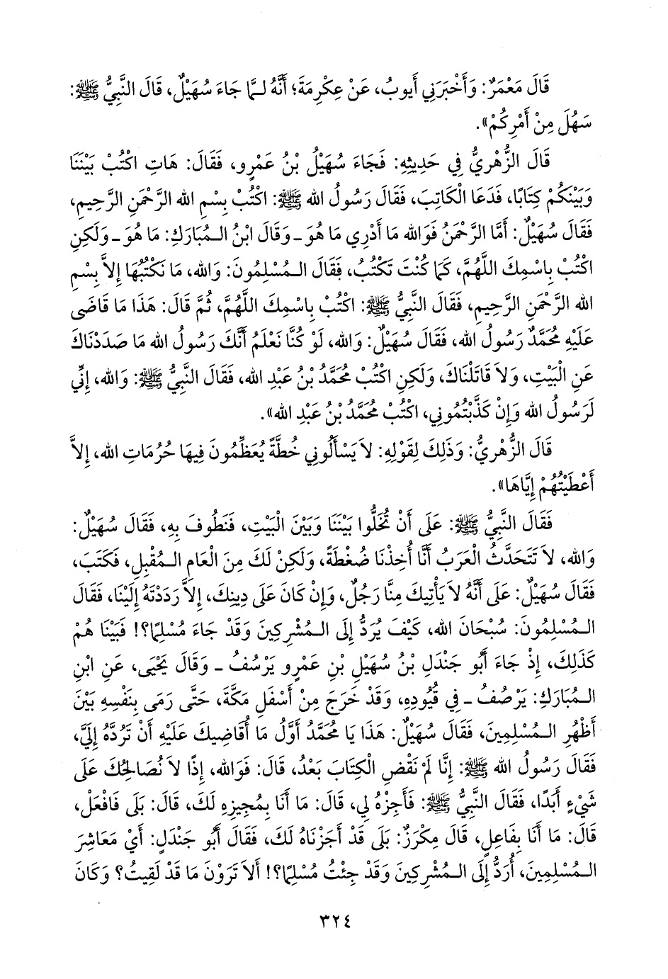 قال الزُّهْري في حديثه: فجاء سهيل بن عَمرو، فقال: هات اكتب بيننا وبينكم كتابا، فدعا الكاتب، فقال رسول الله صَلى الله عَليه وسَلم: اكتب بسم الله الرَّحمَن الرحيم، فقال سهيل: أما الرَّحمَن فوالله ما أدري ما هو، وقال ابن المبارك: ما هو، ولكن اكتب باسمك اللهم، كما كنت تكتب، فقال المسلمون: والله، ما نكتبها إلا بسم الله الرَّحمَن الرحيم، فقال النبي صَلى الله عَليه وسَلم: اكتب باسمك اللهم، ثم قال: هذا ما قاضى عليه محمد رسول الله، فقال سهيل: والله، لو كنا نعلم أنك رسول الله ما صددناك عن البيت، ولا قاتلناك، ولكن اكتب محمد بن عبد الله، فقال النبي صَلى الله عَليه وسَلم: والله، إني لرسول الله وإن كذبتموني، اكتب محمد بن عبد الله».