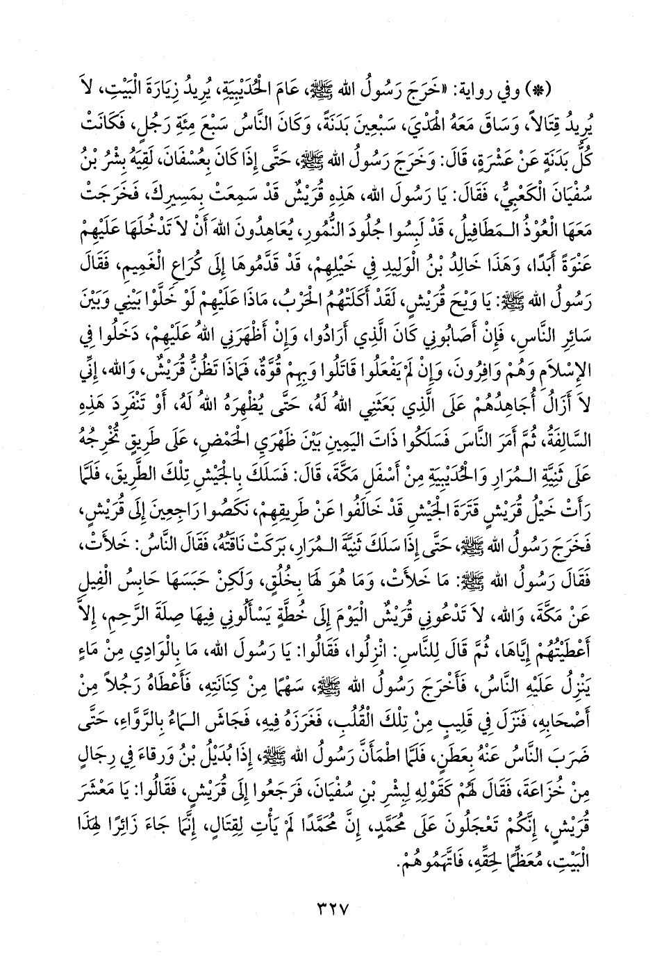 - وفي رواية: «خرج رسول الله صَلى الله عَليه وسَلم عام الحُدَيبيَة، يريد زيارة البيت، لا يريد قتالا، وساق معه الهدي، سبعين بدنة، وكان الناس سبع مئة رجل، فكانت كل بدنة عن عشرة، قال: وخرج رسول الله صَلى الله عَليه وسَلم حتى إذا كان بعُسفان، لقيه بشر بن سفيان الكعبي، فقال: يا رسول الله، هذه قريش قد سمعت بمسيرك، فخرجت معها العوذ المطافيل، قد لبسوا جلود النمور، يعاهدون الله أن لا تدخلها عليهم عنوة أبدا، وهذا خالد بن الوليد في خيلهم، قد قدموها إلى كراع الغميم، فقال رسول الله صَلى الله عَليه وسَلم: يا ويح قريش، لقد أكلتهم الحرب، ماذا عليهم لو خلوا بيني وبين سائر الناس، فإن أصابوني كان الذي أرادوا، وإن أظهرني الله عليهم، دخلوا في الإسلام وهم وافرون، وإن لم يفعلوا قاتلوا وبهم قوة، فماذا تظن قريش، والله، إني لا أزال أجاهدهم على الذي بعثني الله له، حتى يظهره الله له، أو تنفرد هذه السالفة، ثم أمر الناس فسلكوا ذات اليمين بين ظهري الحمض، على طريق تخرجه على ثنية المرار والحُدَيبيَة من أسفل مكة، قال: فسلك بالجيش تلك الطريق، فلما رأت خيل قريش قترة الجيش قد خالفوا عن طريقهم، نكصوا راجعين إلى قريش، فخرج رسول الله صَلى الله عَليه وسَلم حتى إذا سلك ثنية المرار، بركت ناقته، فقال الناس: خلأت، فقال رسول الله صَلى الله عَليه وسَلم: ما خلأت، وما هو لها بخلق، ولكن حبسها حابس الفيل عن مكة، والله، لا تدعوني قريش اليوم إلى خطة يسألوني فيها صلة الرحم، إلا أعطيتهم إياها، ثم قال للناس: انزلوا، فقالوا: يا رسول الله، ما بالوادي من ماء ينزل عليه الناس، فأخرج رسول الله صَلى الله عَليه وسَلم سهما من كنانته، فأعطاه رجلا من أصحابه، فنزل في قليب من تلك القلب، فغرزه فيه، فجاش الماء بالرواء، حتى ضرب الناس عنه بعطن، فلما اطمأن رسول الله صَلى الله عَليه وسَلم إذا بديل بن ورقاء في رجال من خزاعة، فقال لهم كقوله لبشر بن سفيان، فرجعوا إلى قريش، فقالوا: يا معشر قريش، إنكم تعجلون على محمد، إن محمدا لم يأت لقتال، إنما جاء زائرا لهذا البيت، معظما لحقه، فاتهموهم.