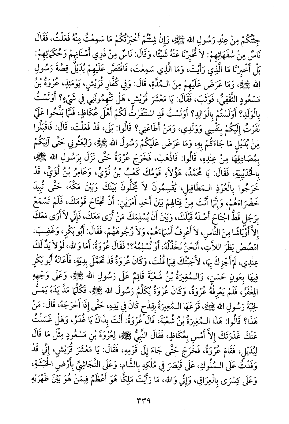 قال: فاقبلوا من بديل ما جاءكم به، وما عرض عليكم رسول الله صَلى الله عَليه وسَلم وابعثوني حتى آتيكم بمصادقها من عنده، قالوا: فاذهب, فخرج عروة حتى نزل برسول الله صَلى الله عَليه وسَلم بالحُدَيبيَة، فقال: يا محمد, هؤلاء قومك كعب بن لؤي، وعامر بن لؤي، قد خرجوا بالعوذ المطافيل, يقسمون لا يخلون بينك وبين مكة، حتى تبيد خضراءهم, وإنما أنت من قتالهم بين أحد أمرين: أن تجتاح قومك, فلم تسمع برجل قط اجتاح أصله قبلك, وبين أن يسلمك من أرى معك, فإني لا أرى معك إلا أوباشا من الناس, لا أعرف أسماءهم، ولا وجوههم، فقال أَبو بكر، وغضب: امصص بظر اللات, أنحن نخذله، أو نسلمه؟! فقال عروة: أما والله، لولا يد لك عندي، لم أجزك بها، لأجبتك فيما قلت, وكان عروة قد تحمل بدية، فأعانه أَبو بكر فيها بعون حسن, والمغيرة بن شعبة قائم على رسول الله صَلى الله عَليه وسَلم وعلى وجهه المغفر, فلم يعرفه عروة, وكان عروة يكلم رسول الله صَلى الله عَليه وسَلم فكلما مد يده يمس لحية رسول الله صَلى الله عَليه وسَلم قرعها المغيرة بقدح كان في يده, حتى إذا أحرجه، قال: من هذا؟ قالوا: هذا المغيرة بن شعبة، قال عروة: أنت بذاك يا غدر, وهل غسلت عنك غدرتك إلا أمس بعكاظ، فقال النبي صَلى الله عَليه وسَلم لعروة بن مسعود مثل ما قال لبديل, فقام عروة، فخرج حتى جاء إلى قومه، فقال: يا معشر قريش, إني قد وفدت على الملوك, على قيصر في ملكه بالشام, وعلى النجاشي بأرض الحبشة, وعلى كسرى بالعراق, وإني والله، ما رأيت ملكا هو أعظم فيمن هو بين ظهريه