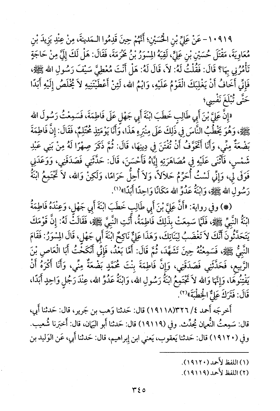 ١٠٩١٩ - عن علي بن الحسين؛ أنهم حين قدموا المدينة، من عند يزيد بن معاوية، مقتل حسين بن علي، لقيه المسور بن مخرمة، فقال: هل لك إلي من حاجة تأمرني بها؟ قال: فقلت له: لا، قال له: هل أنت معطي سيف رسول الله صَلى الله عَليه وسَلم فإني أخاف أن يغلبك القوم عليه، وايم الله، لئن أعطيتنيه لا يخلص إليه أبدا حتى تبلغ نفسي؛