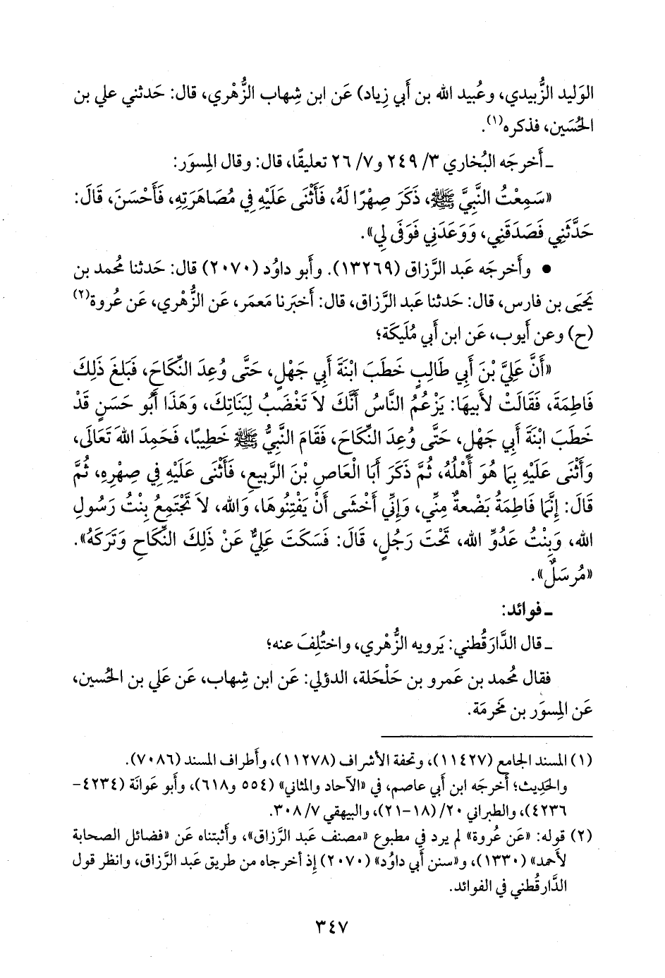 وخالفهم معمر، فقال: عن الزُّهْري، عن عروة مرسلا؛ أن علي بن أبي طالب خطب بنت أبي جهل، ولم يذكر المسور.