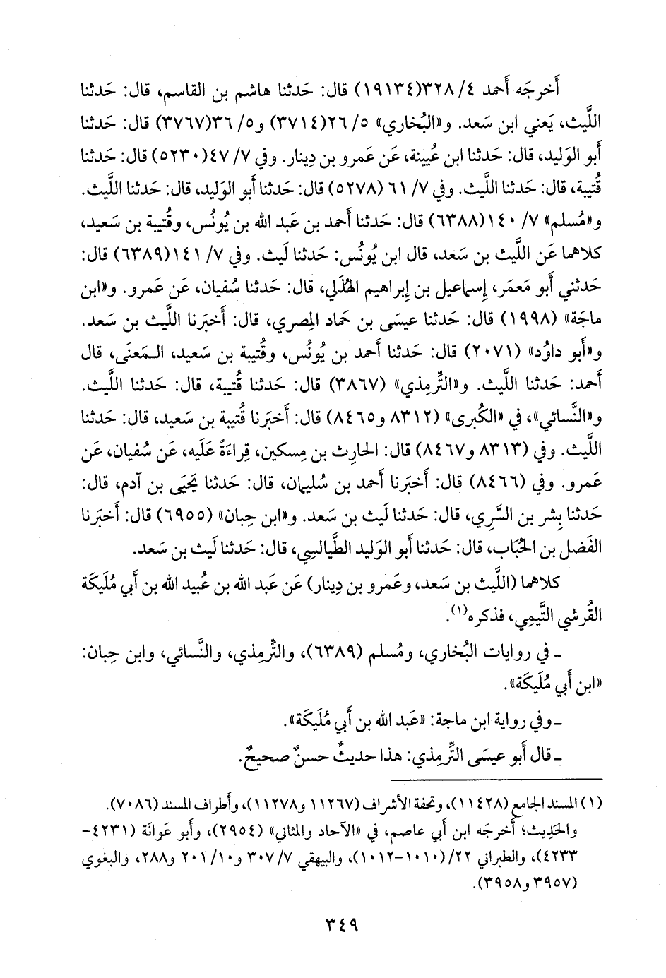 و «التِّرمِذي» (٣٨٦٧) قال: حدثنا قتيبة، قال: حدثنا الليث. و «النَّسَائي» في «الكبرى» (٨٣١٢ و ٨٤٦٥) قال: أخبرنا قتيبة بن سعيد، قال: حدثنا الليث. وفي (٨٣١٣ و ٨٤٦٧) قال: الحارث بن مسكين، قراءة عليه، عن سفيان، عن عَمرو. وفي (٨٤٦٦) قال: أخبرنا أحمد بن سليمان، قال: حدثنا يحيى بن آدم، قال: حدثنا بشر بن السَّري، قال: حدثنا ليث بن سعد. و «ابن حِبَّان» (٦٩٥٥) قال: أخبرنا الفضل بن الحُبَاب، قال: حدثنا أَبو الوليد الطيالسي، قال: حدثنا ليث بن سعد.