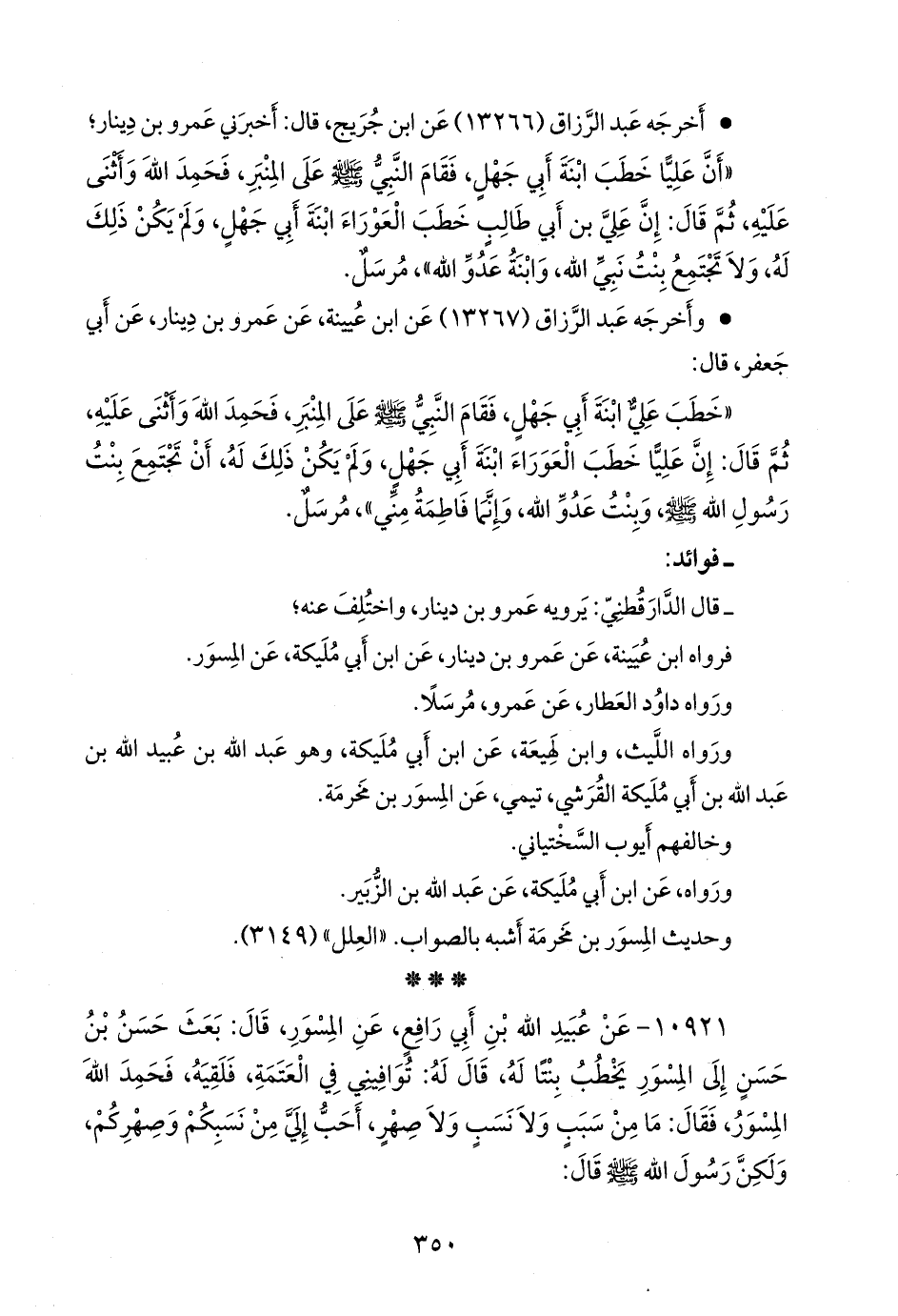 ١٠٩٢١ - عن عُبيد الله بن أبي رافع، عن المسور، قال: بعث حسن بن حسن إلى المسور يخطب بنتا له، قال له: توافيني في العتمة، فلقيه، فحمد الله المسور، فقال: ما من سبب ولا نسب ولا صهر، أحب إلي من نسبكم وصهركم، ولكن رسول الله صَلى الله عَليه وسَلم قال: