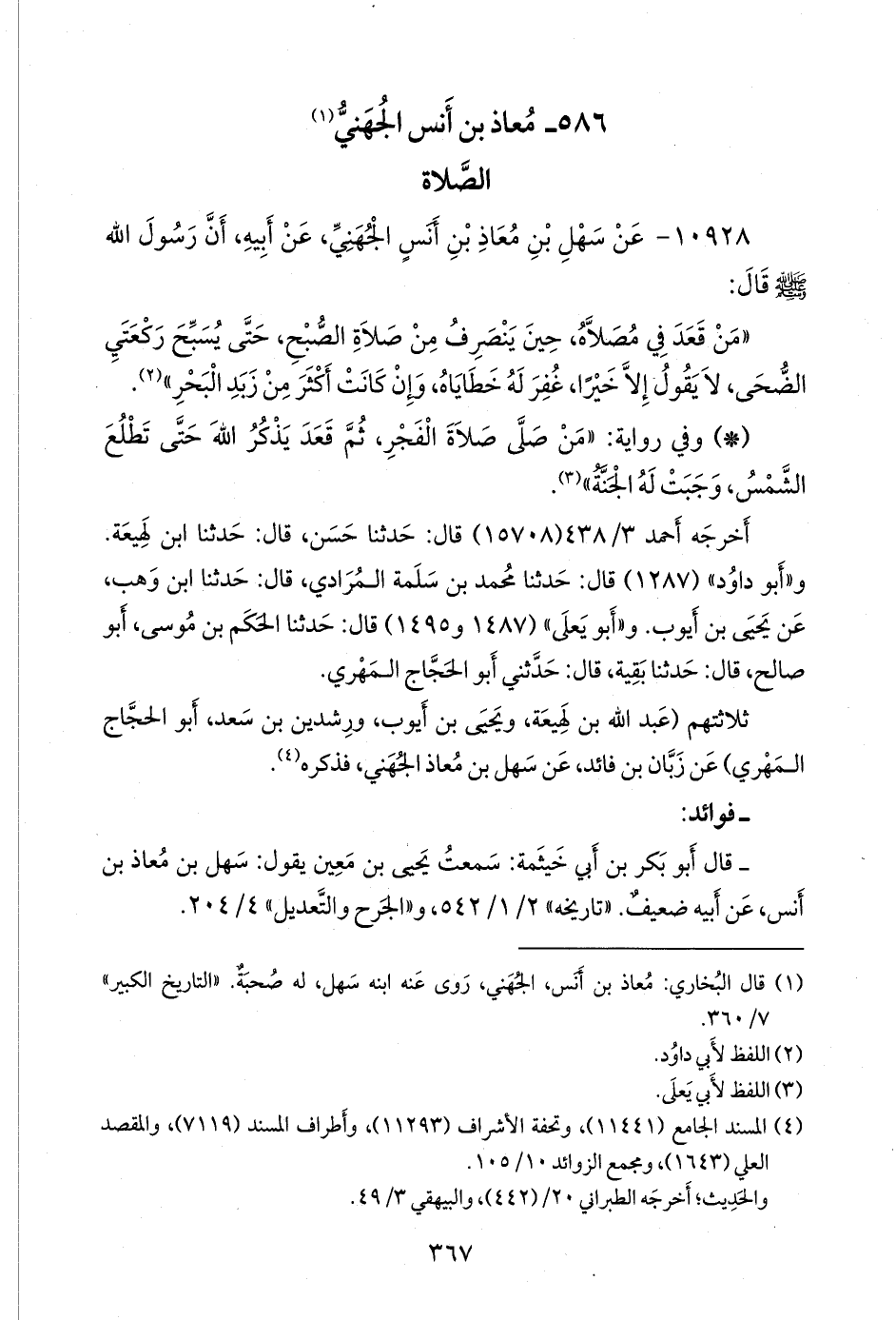 - قلنا إِسناده ضعيفٌ؛ قال ابن أَبي خيثمة: سمعتُ يحيى بن مَعين يقول: سهل بن معاذ بن أَنس، عن أَبيه، ضعيف. «الجرح والتعديل» ٤/ ٢٠٤.