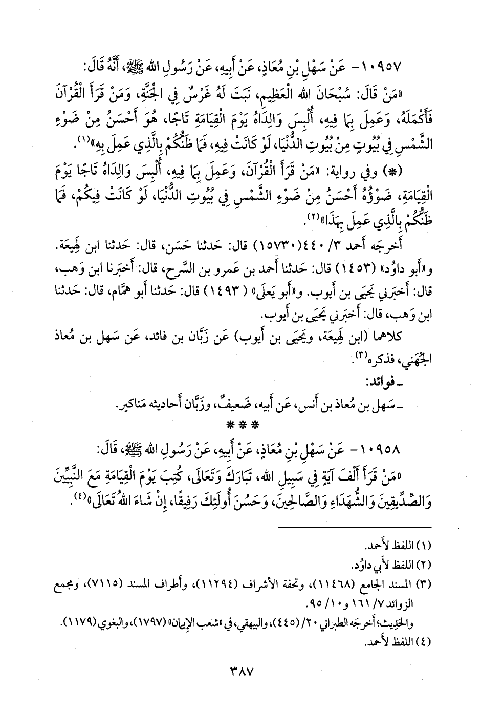 - قلنا إِسناده ضعيفٌ؛ لضعف سهل بن معاذ، وزبان بن فائد. انظر فوائد الحديث رقم (١٠٩٢٨).